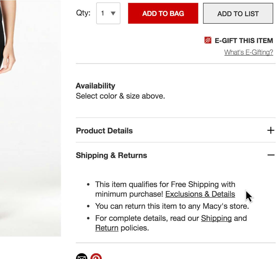 In the cart Macy’s uses IP geo-targeting to estimate a user’s shipping and tax costs — a good thing in itself (first image). However, this estimate isn’t presented to users on the product page, despite having a section reading “Shipping” (second image).
