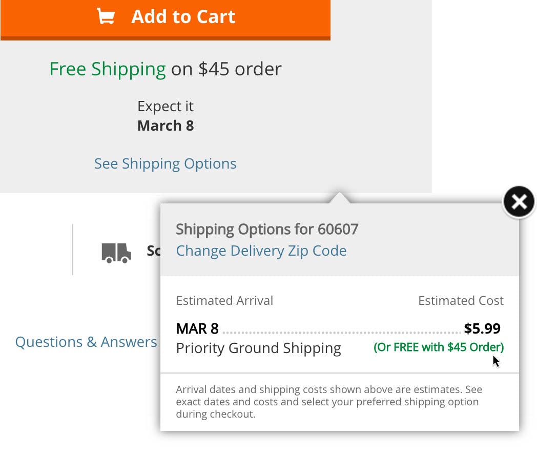 The shipping tooltip at Home Depot makes it clear both how much shipping is estimated to cost and what the threshold is for free shipping — testing clearly revealed that users need both pieces of information to evaluate if it’s worthwhile to reach the free shipping threshold.