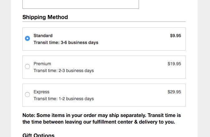 Users at Macy’s will have a difficult time assessing when they might receive their order, as they’ll simply have to guess Macy’s processing times as well as account for holidays and weekends to convert the transit business days into an estimated date of delivery.
