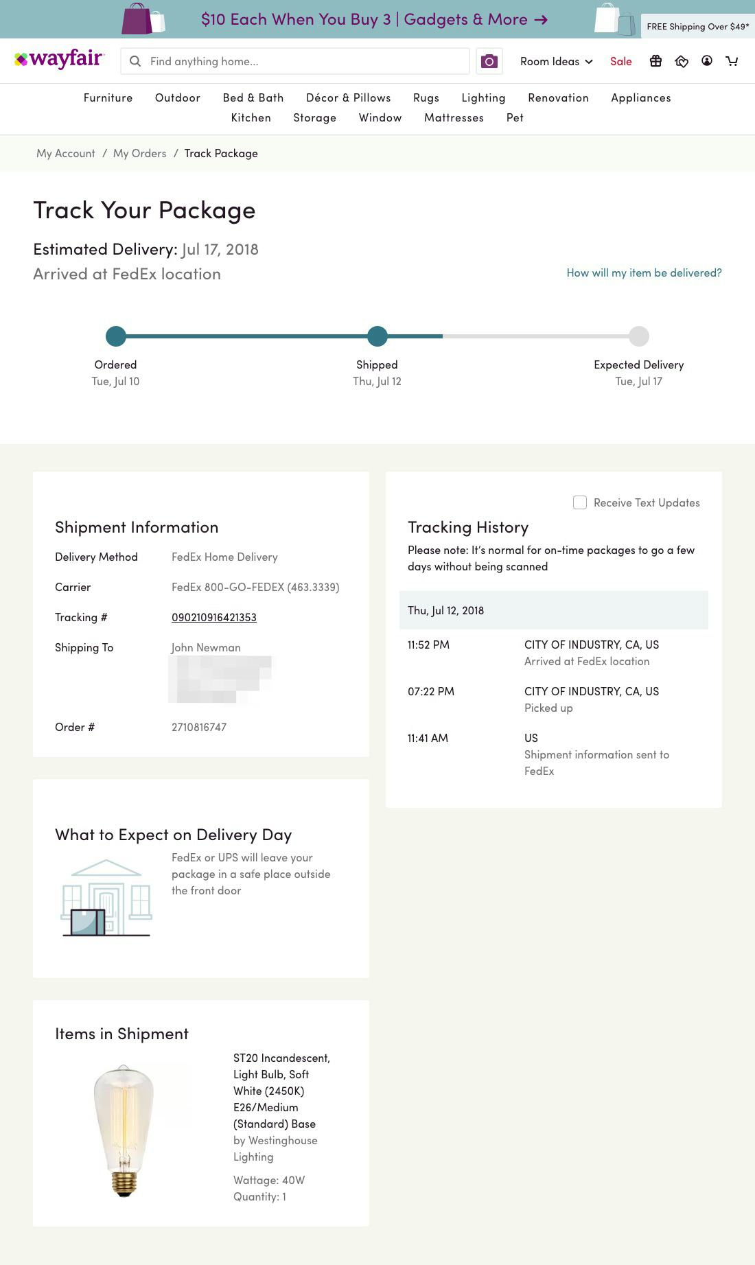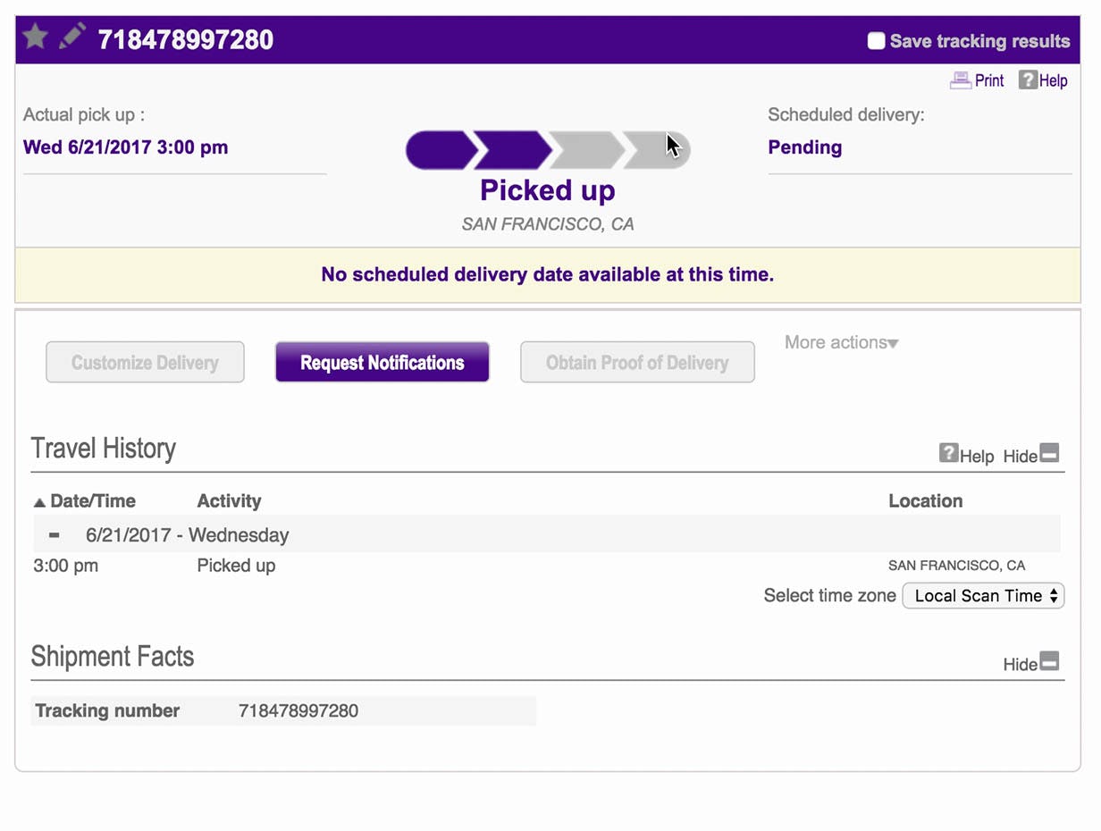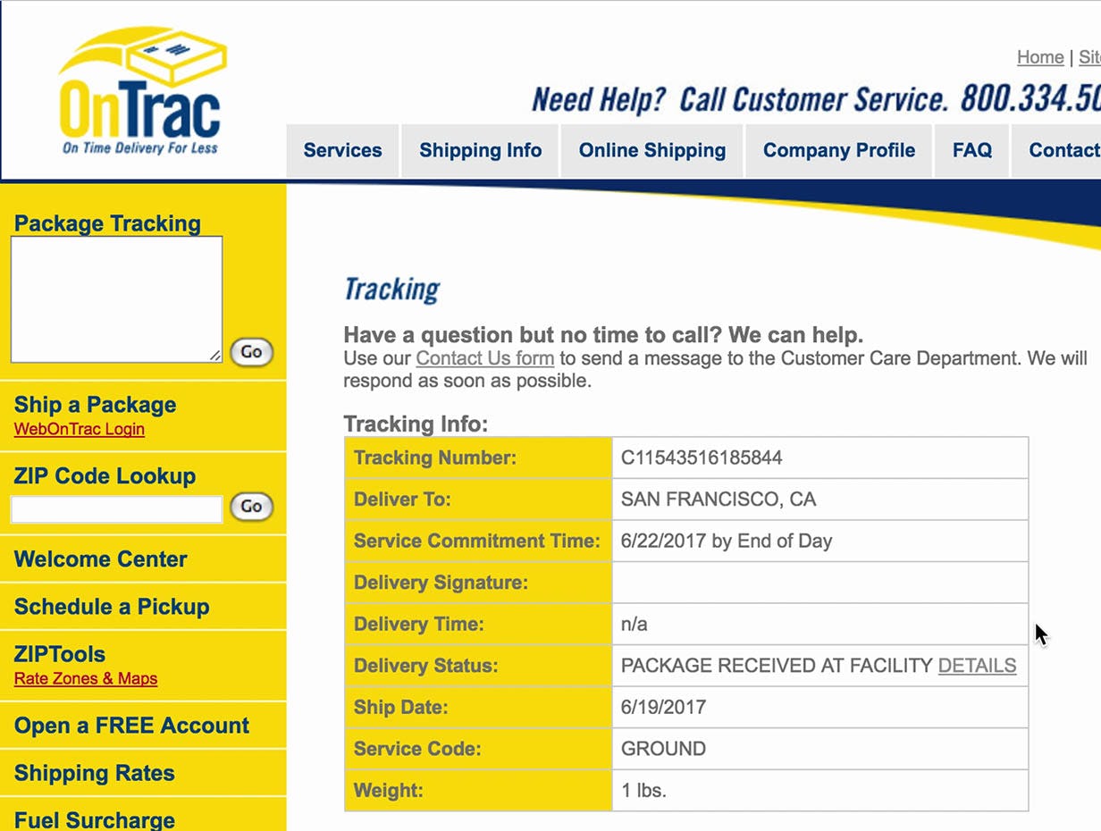 Both the layout and the terminology on third-party tracking sites is out of the e-commerce site’s control, so any UX issues here will essentially be the e-commerce site’s UX issues, but without any option for the user to resolve it. For example, the interface for OnTrac uses industry jargon like “Service Commitment Time” (instead of the more normal “Delivery/Arrival Date”), and the delivery date is difficult to see (first image). On FedEx (second image), a user during testing was confused by some of the descriptions, saying, “‘Picked Up’ vs ‘Pending’…It says it is picked up? It says it’s pending? I am really confused”.