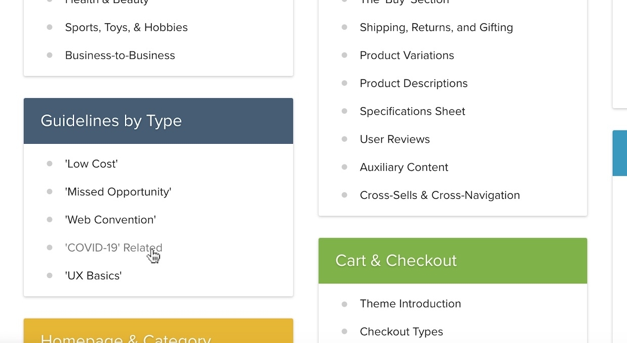 These are only a handful of the guidelines we’ve singled out as being particularly important for sites to consider during the COVID-19 crisis. There are 52 more that should be considered to ensure users are able to successfully browse and purchase products in the current uncertain environment.