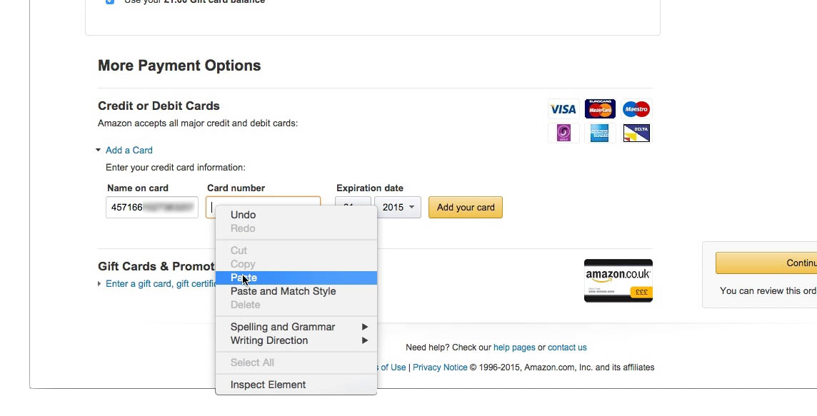 At a minimum, this causes needless form-filling friction, but it may also lead to security issues as users copy/paste sensitive card information (as observed during testing), not to mention needless card validation errors for those users who end up submitting the form. In particular, not having the “Card Number” as the first form field was observed to cause issues.