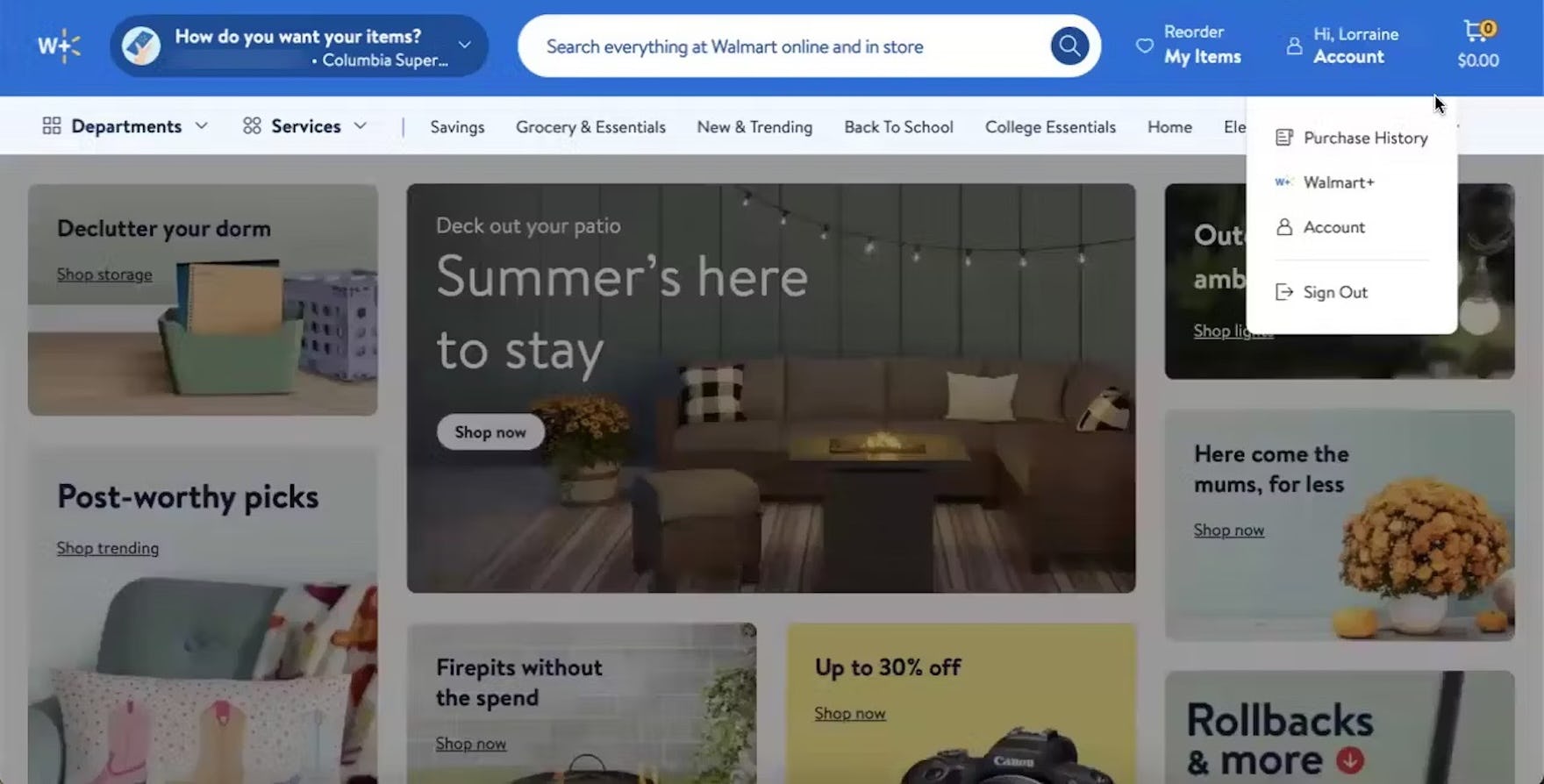 At Walmart, the account menu is heavily truncated to only 3 links, forcing users seeking to accomplish account-related tasks such as managing saved payment options, addresses, passwords, etc. to first navigate to the account dashboard via the “Account” link, then search for a link to the desired feature. In practice, heavily truncated account menus make it more difficult for users to get an overview of the features available and begin desired order- and account-related tasks.