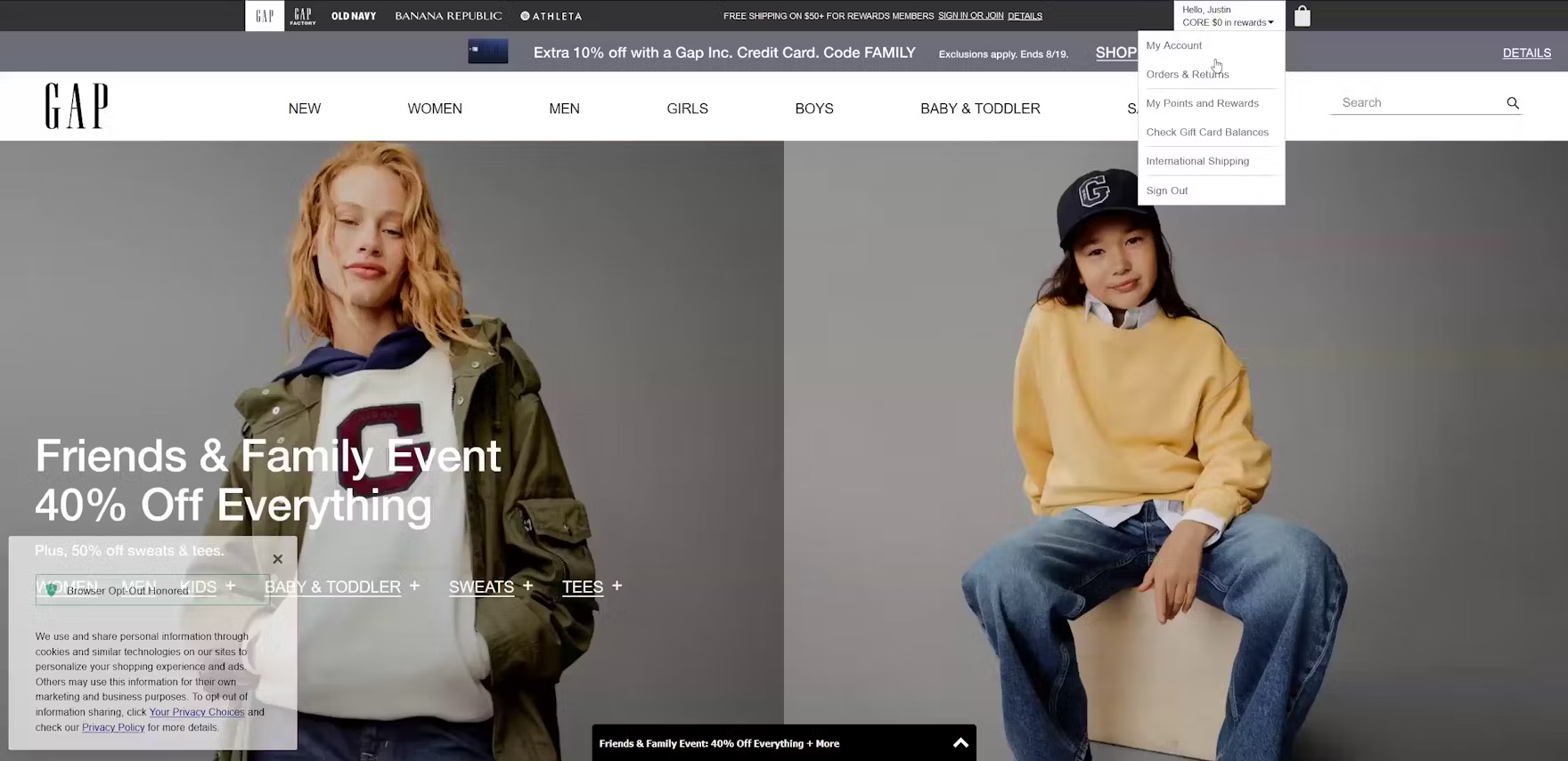 The account menu at GAP is heavily truncated to 3 account-related links, plus links to check gift card balances and international shipping. Prioritizing features that only a subgroup of users will find useful over core account features creates unnecessary navigation friction for a majority of users.
