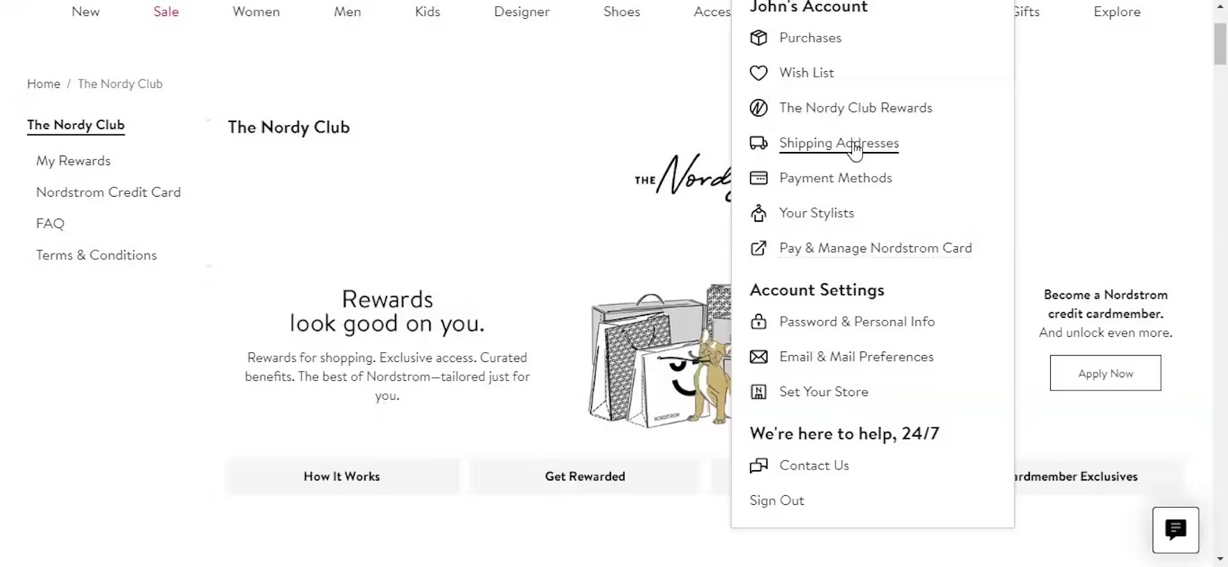 “So I go to my name first, and then I go to my shipping addresses”, explained a participant at Nordstrom seeking to add a new shipping address. He opened the account menu and quickly spotted the “Shipping Address” link to the address book. Notably, the account menu contained direct paths to his orders, loyalty program activity, managing his payment methods, shipping addresses, wishlist, and password. The heading “John’s Account” was also linked directly to his account dashboard.