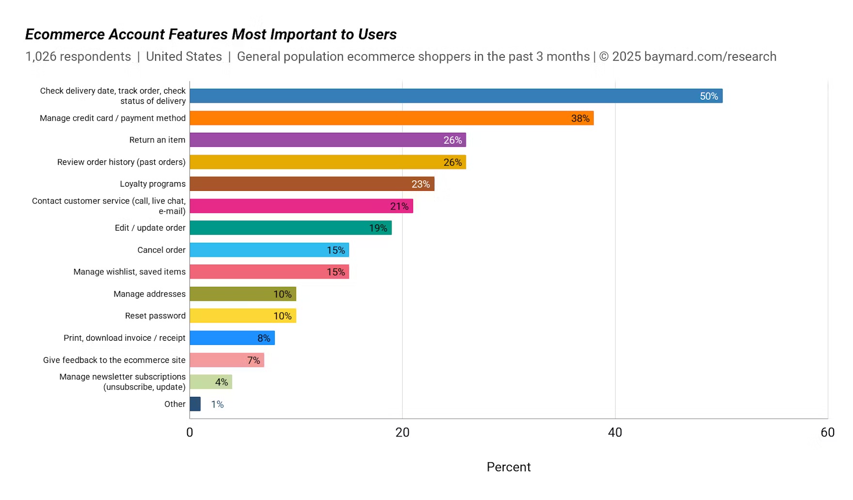To better understand what features should be provided in the account menu, Baymard commissioned a quantitative study with 1,026 US online shoppers to understand what account features are generally the most important to users. The findings support our qualitative research (“Contact customer service” is often provided in the sitewide header outside of the account menu).