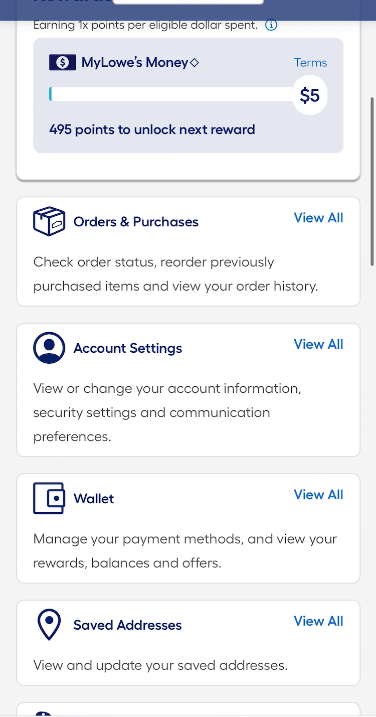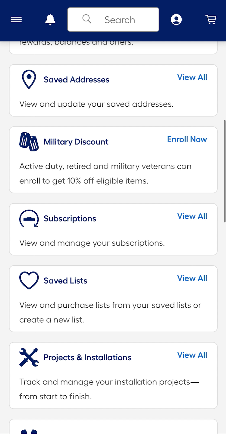 At Lowe’s, paths to key order- and account-related features are provided as direct links or grouped into broader categories such as “Account Settings” on the dashboard (first image). Clear labeling and secondary text descriptions provide additional context for all features, including site-specific secondary features like “Military Discount” and “Projects & Installations”, which may be unfamiliar to users (second image).