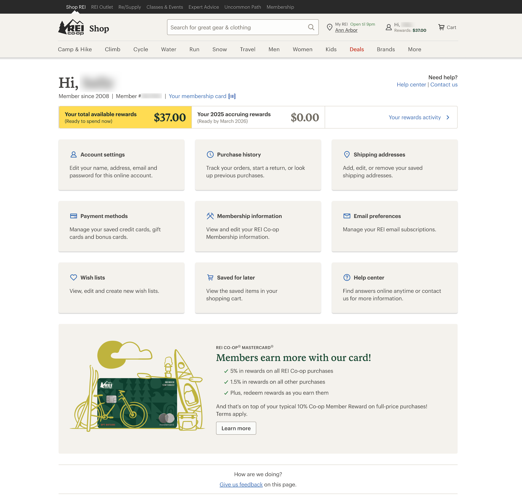 REI’s account dashboard provides direct links to orders, stored addresses and payments, loyalty information, and lists. Meanwhile, related features are grouped under “Account settings” and “Help center”.