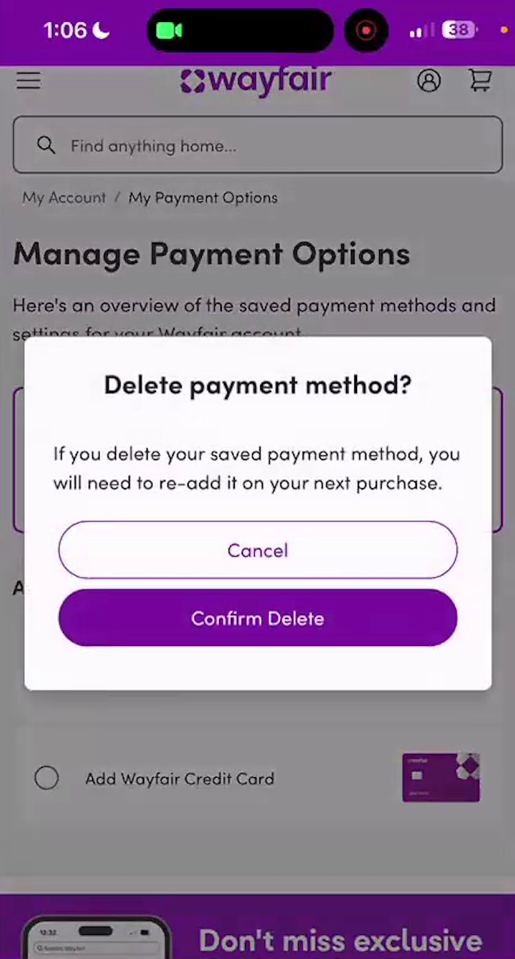 “‘Manage credit and debit card’, and, so we’re going to edit that, and I would click on that. Okay. Well, okay. It looks like it’s only giving me an option to delete it, not actually update it. Let me see if there’s another way. Nope. Okay. Let me go back on and maybe I missed something. Nope. Looks like that might be the only way. Let me see if maybe there’s a different option on this. Nope. Well, it looks like I will have to delete the debit card and then reenter it.” A participant at Wayfair spent 2.5 minutes figuring out she had to delete the existing card and re-add it to edit the expiration date.