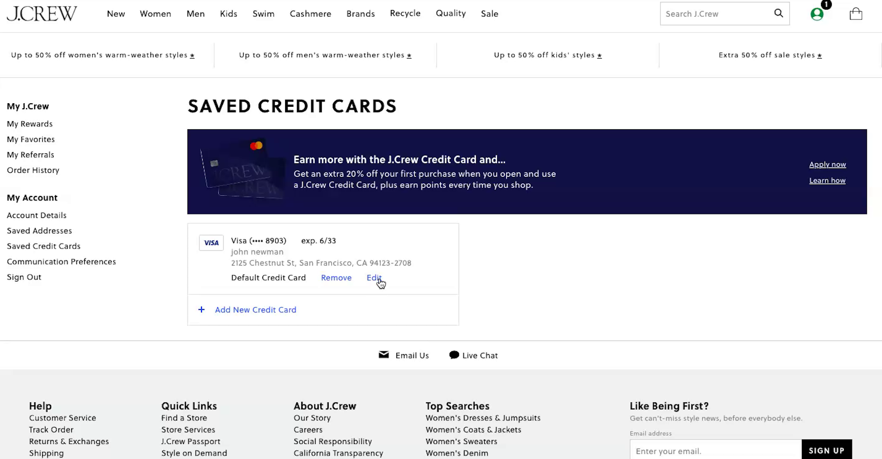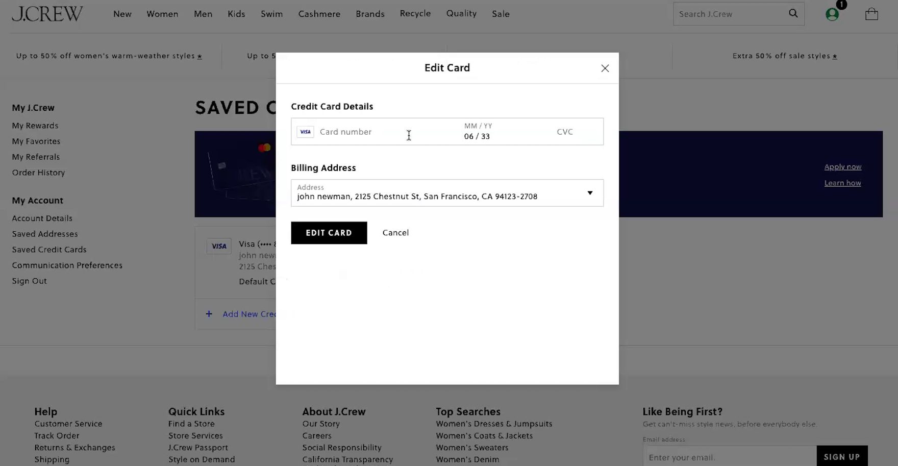 At J.Crew, a participant chose to “edit” the credit card. First, the old partially hidden card number was shown (first image). But as the participant clicked “Edit” a field appeared allowing the participant to type in the new credit card details (second image). In effect, the stored credit card interface provided what appeared to be a 1-step process for editing credit card data. In reality, the interface created a fake edit feature by combining 2 processes — deleting an old card number and adding a new one — within a single “edit card” task.