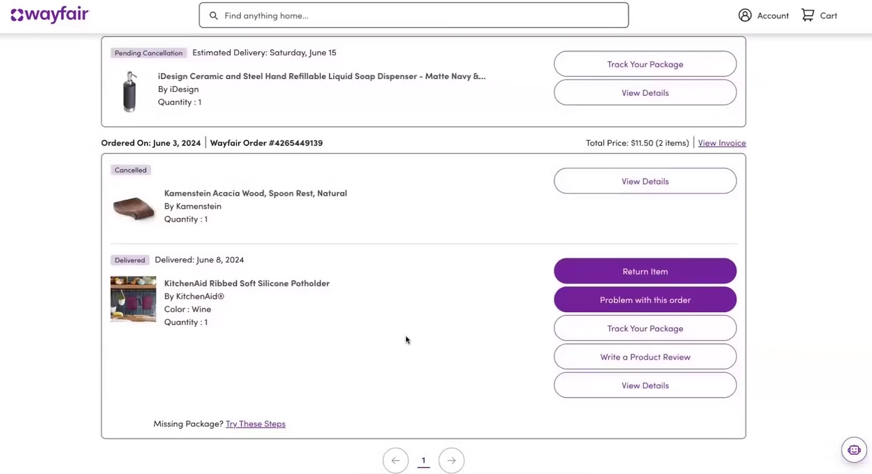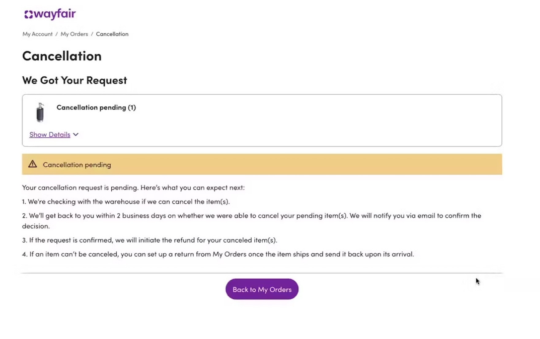 “It says ‘cancellation pending’”. At Wayfair, a participant noted the “Cancellation pending” message after he clicked to cancel an order (first image). Checking the order history page, he confirmed that the status of the order was listed as “Pending Cancellation” (second image).