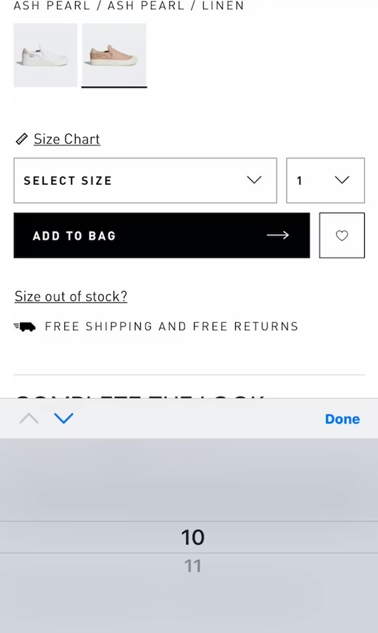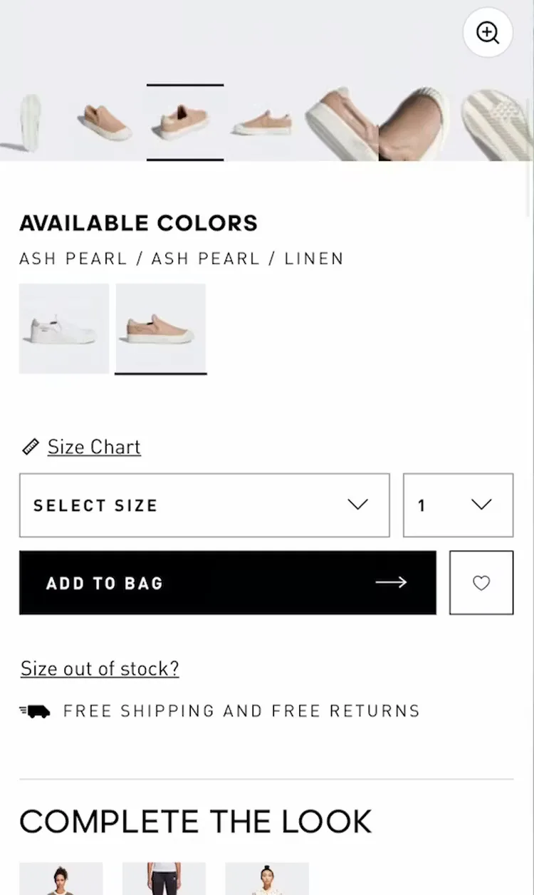 “These are cute!” This user shopping on Adidas found a pair of shoes she liked (first image) but couldn’t see that her size was out of stock until she interacted with the size drop-down menu: “Oh, they don’t have my size” (second image). Hiding sizes within a menu makes it harder to tell what sizes are in stock, which can set users up for disappointment.