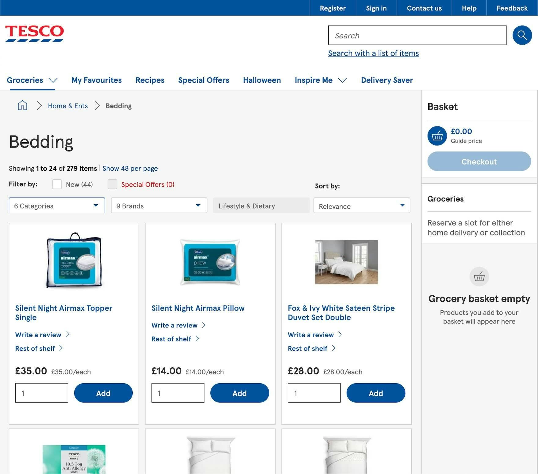 Users shopping the “Bedding” category at Tesco are unable to filter by price, user ratings, size, or color. Instead, they must wade through a list of 279 items without the ability to narrow the scope using these essential factors.