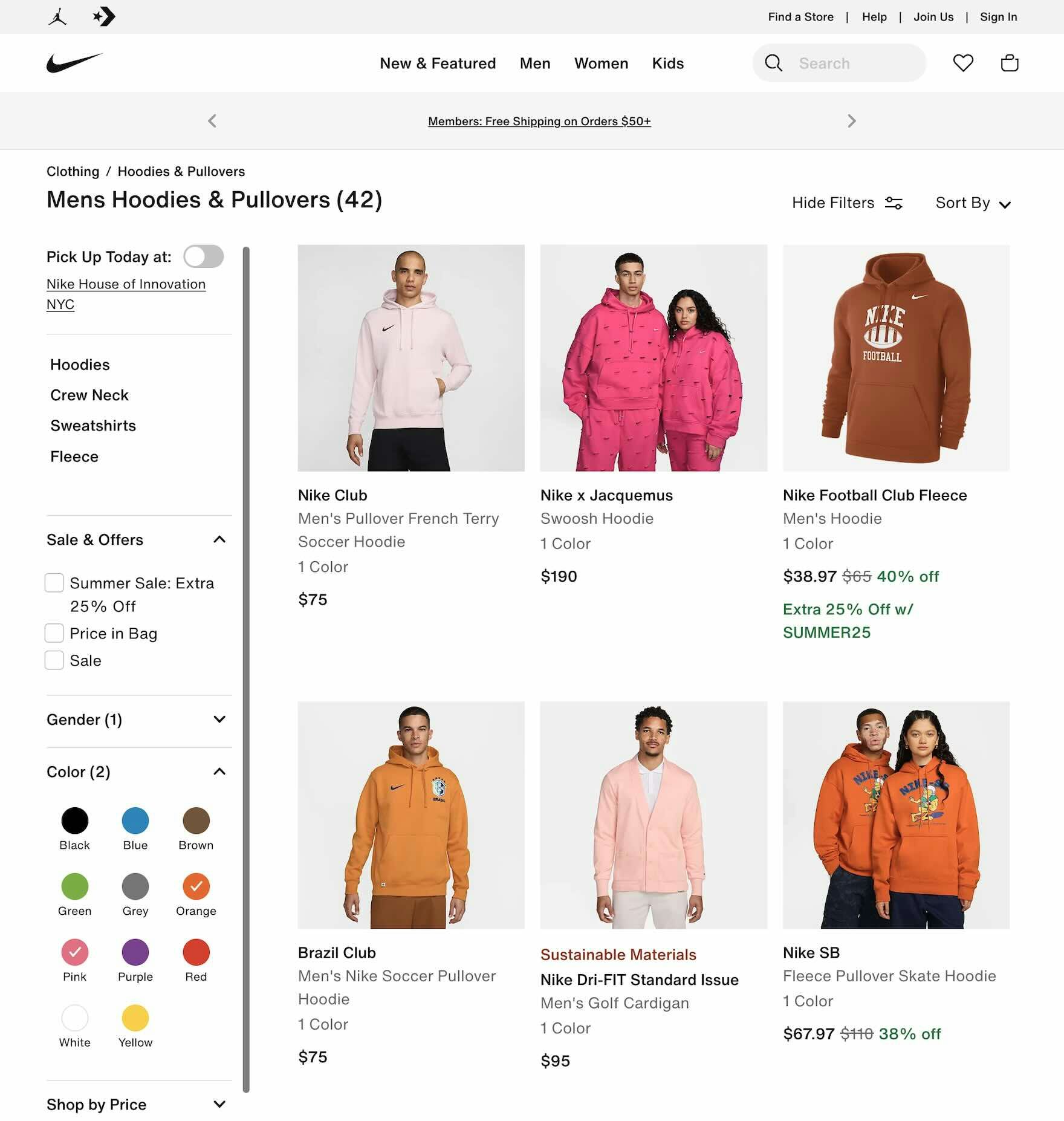 On desktop, the absence of an applied filters overview can slow users down when they need to check which filter options they have selected. If multiple filter options are applied and are out of view because they are spread across more than one viewport — as can be the case with a tall sidebar such as here at Nike — it will take longer to find all of the applied filters than if an overview were present.
