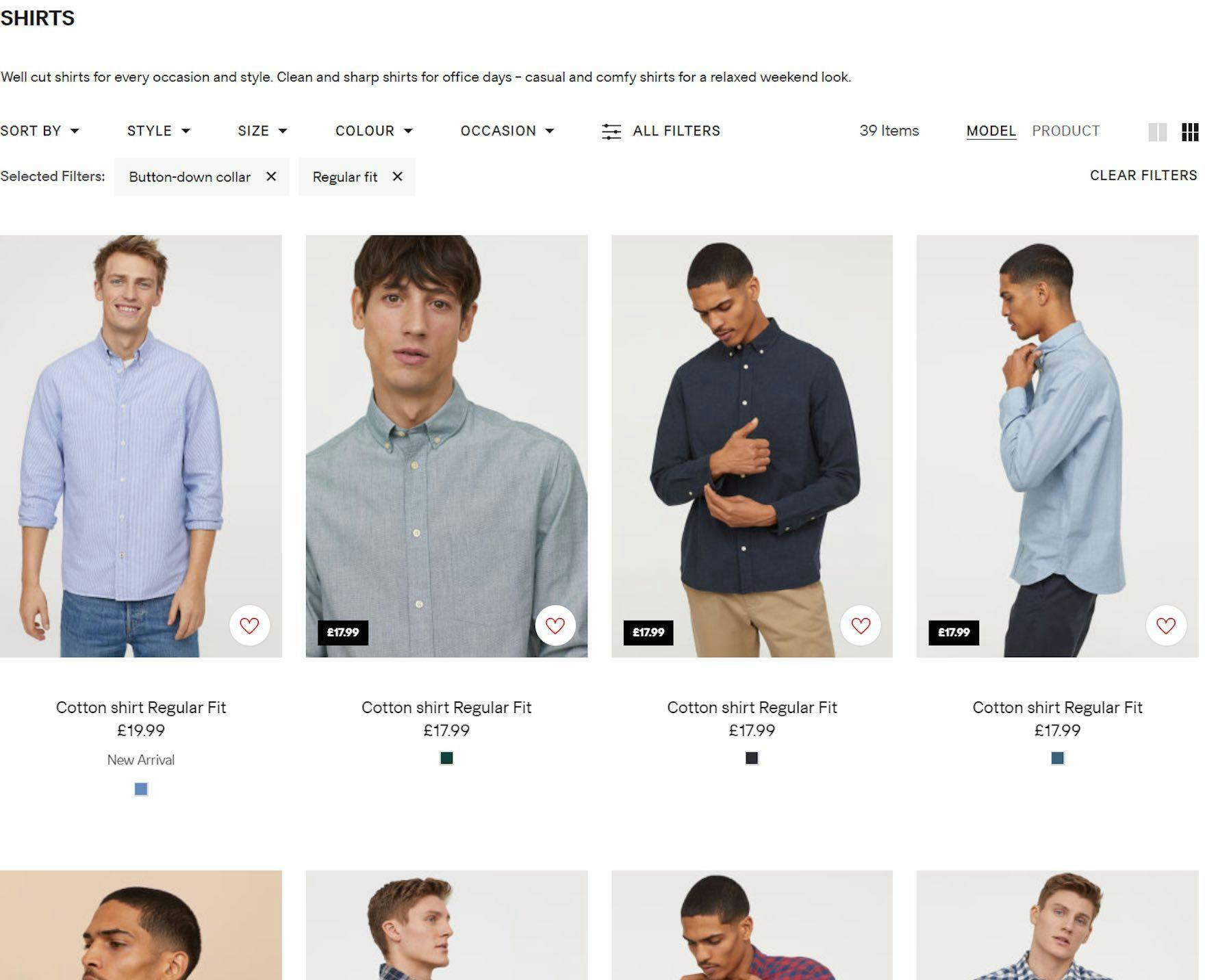At H&M, color variations of shirts are shown separately. Users thus have a larger and more cluttered list to browse and it is difficult to figure out how many distinct products exist.