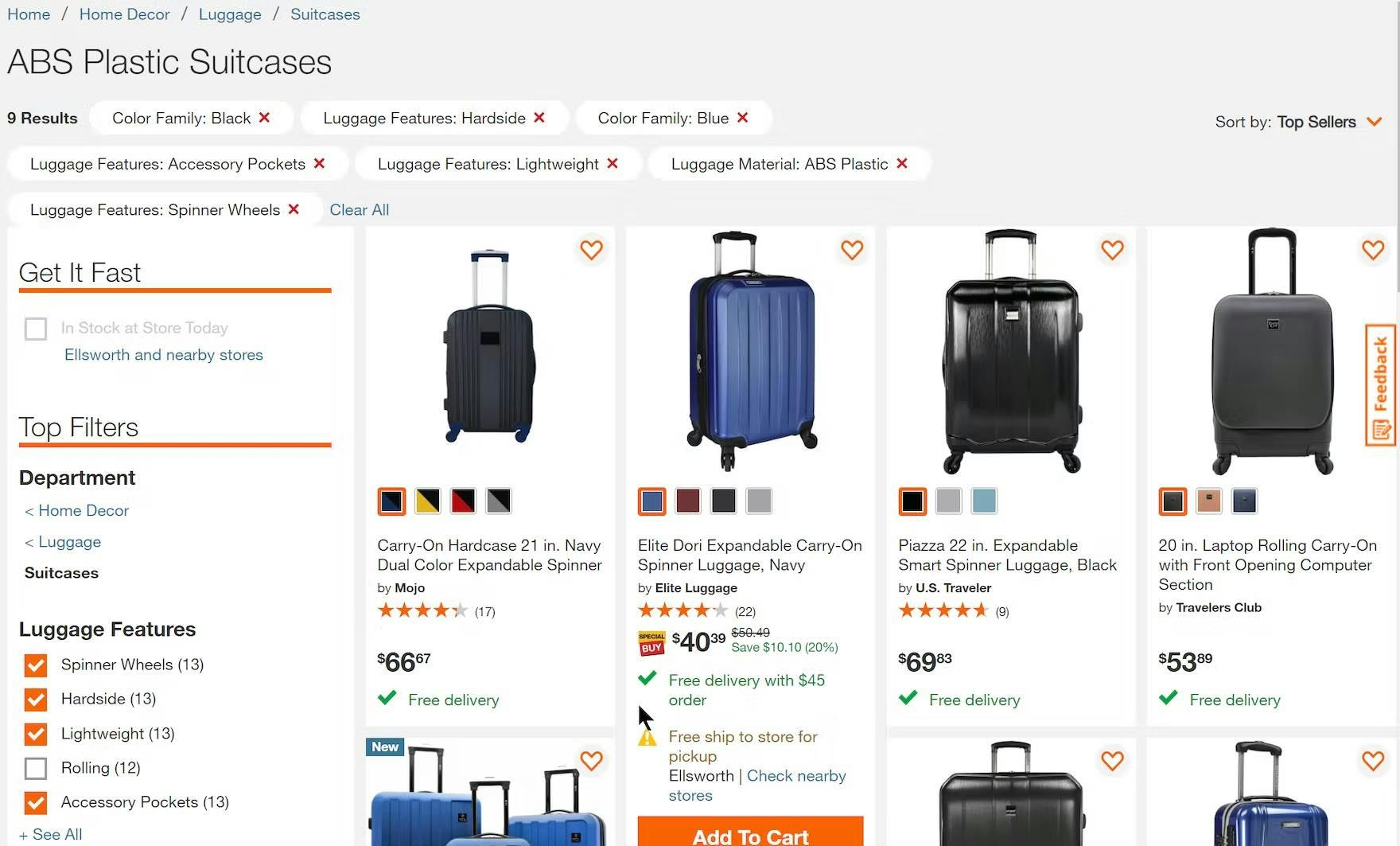 Applied filter options on Home Depot are large and very obvious. The red “Xs” within the applied filters also help to draw attention, and the “Clear All” link allows for their easy removal. Users will find it easy to confirm what filters are applied, remove those that are not needed, and keep apprised of the context of the list.