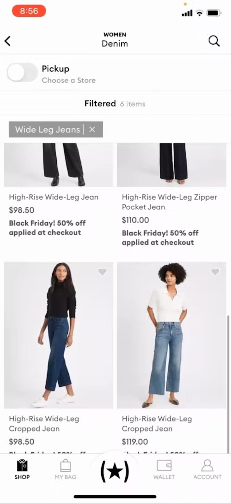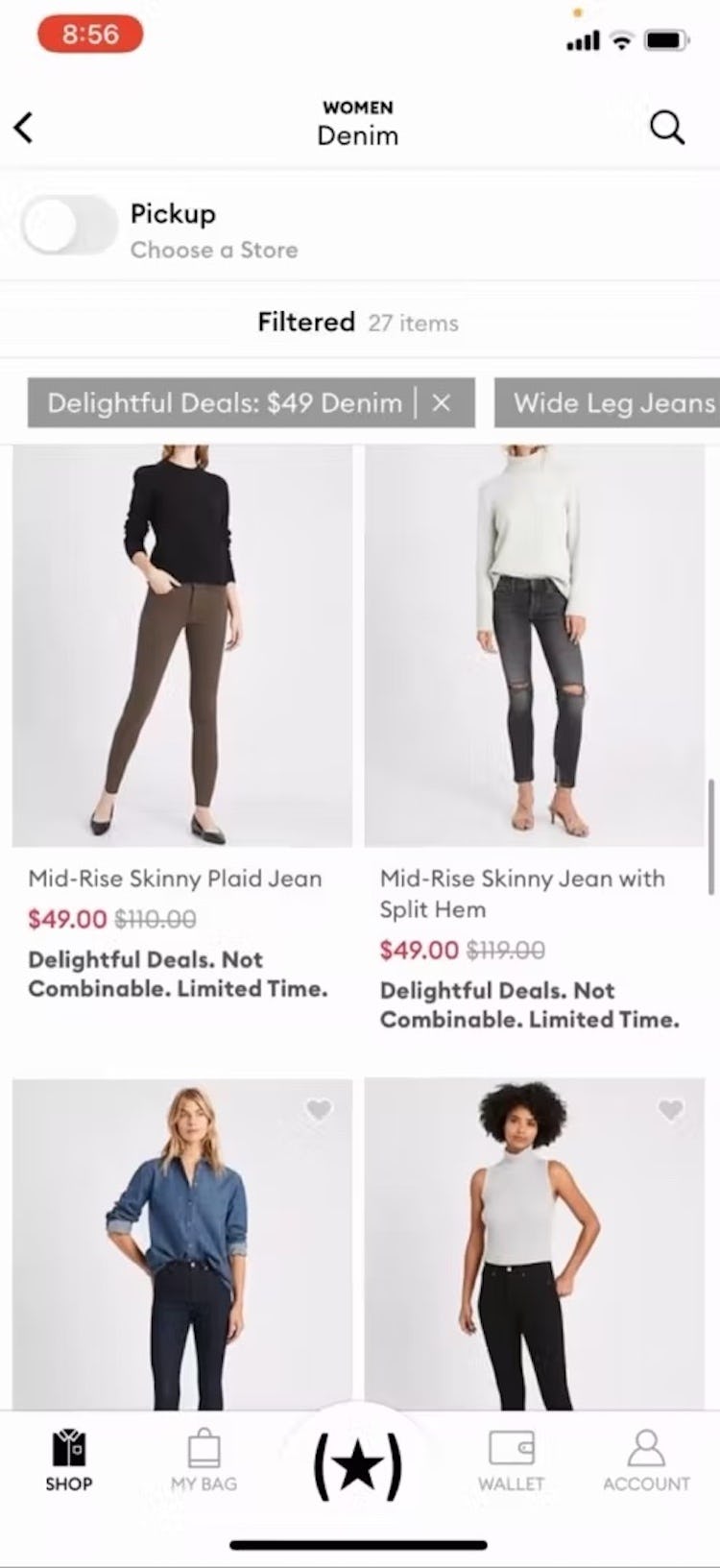 “I’m going to get rid of that [filter]…okay.” The use of horizontally scrolling applied filters in the Banana Republic app made it very easy for this participant to remove one. In this case, the width of the two filters made it easy to see that there was more than one applied.
