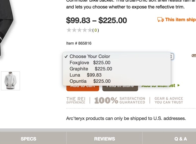 A native drop-down versus a custom drop-down for selecting color variations. Notice how color names such as “Foxglove” and “Opuntia” are a lot easier to decipher with thumbnails next to them. The price points are also easier to scan due to the controlled right-hand alignment.