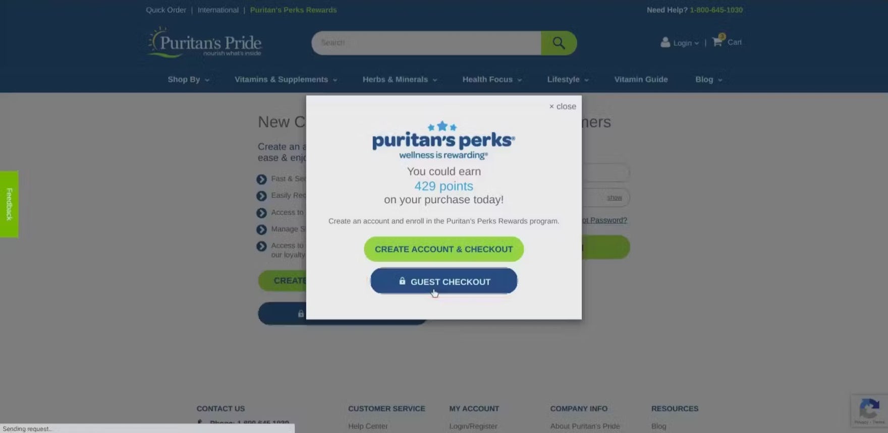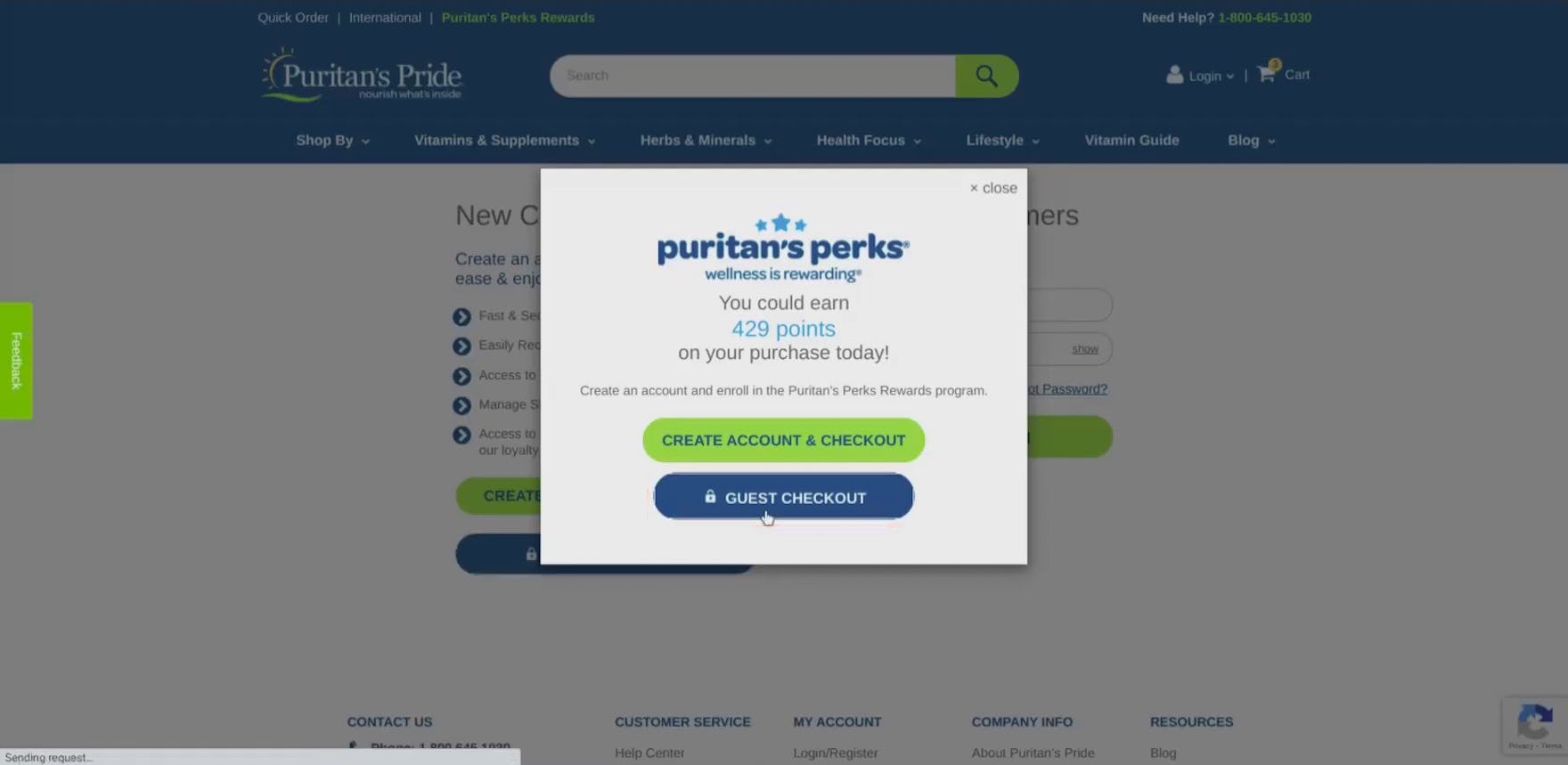 “This is annoying…I don’t want to just stop what I’m doing to go create an account, verify my email, then come back here. That’s a lot for me to do. Just let me check out as a guest. I’m wondering if it lets me do that.” Wary of the commitment required to create an account, this participant at Puritan’s Pride opted for the “Guest Checkout” option when invited to register prior to checkout (first image). However, rather than continuing to checkout, he was then prompted a second time to create an account, initially misinterpreting the overlay to mean he would need to register after all (second image): “Nope, it doesn’t [let you check out as a guest]. Why wouldn’t they say that?”.