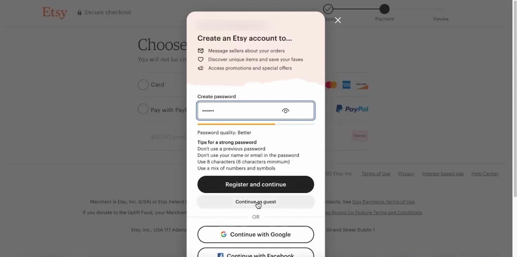 “I want to ‘Continue as guest’.” Checking out at Etsy, this participant selected the prominent option for “Continue as a guest” (first image), yet halfway through checkout was presented with another surprise invitation to create an account, this time with the “Continue as guest” option much more subdued (second image). Mistaking that she had to create an account in order to continue, she began inputting a password before noticing the link to continue without registering. Repeatedly inviting users to create an account at the beginning and during checkout can come across as “pushy” or even deceptive.