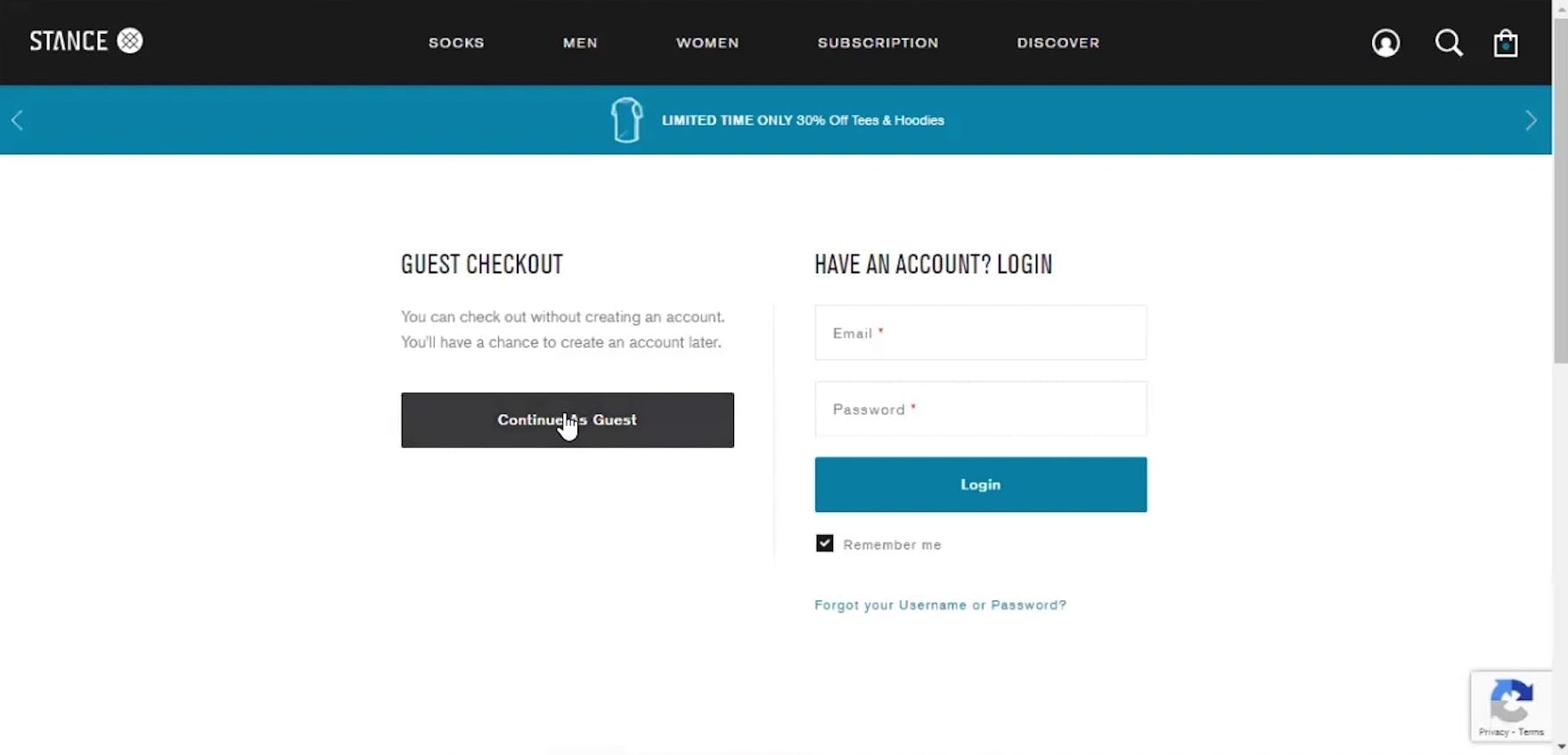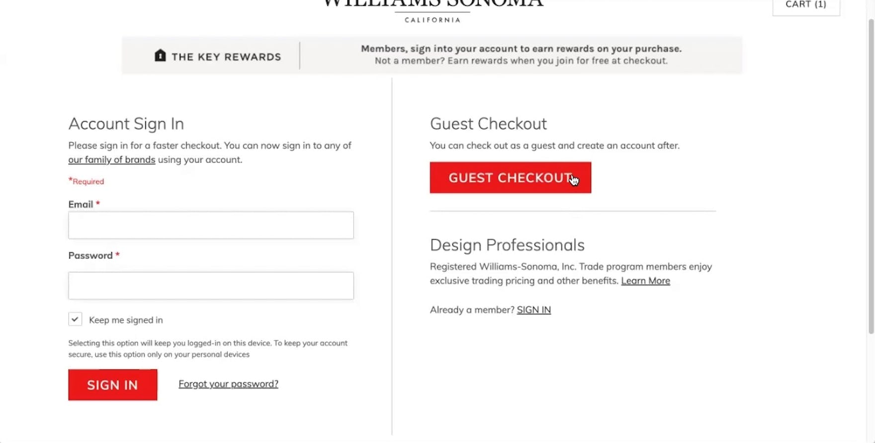 During testing at Stance (first image) and Williams Sonoma (second image), participants selecting the “Guest Checkout” option were reassured that they could create an account following checkout, allowing them to devote their focus to getting through the checkout process.
