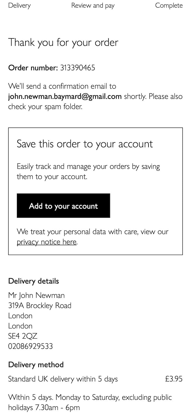 At John Lewis, users are informed when selecting “Continue as guest” that they can create an account later (first image). Following checkout, they can then add the order to their existing account or create an account — which will be perceived by many as less taxing because all that is required at this point is a password.