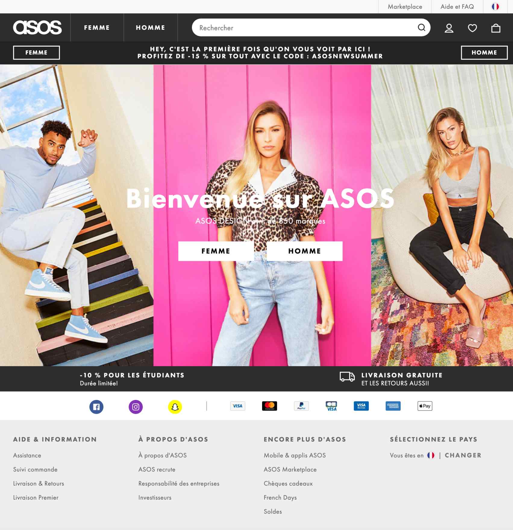 In contrast, Asos uses IP geotargeting to identify the user’s location and displays a flag icon in the upper-right corner as well as in the footer. This approach is makes it’s easy for users to change the country or language.