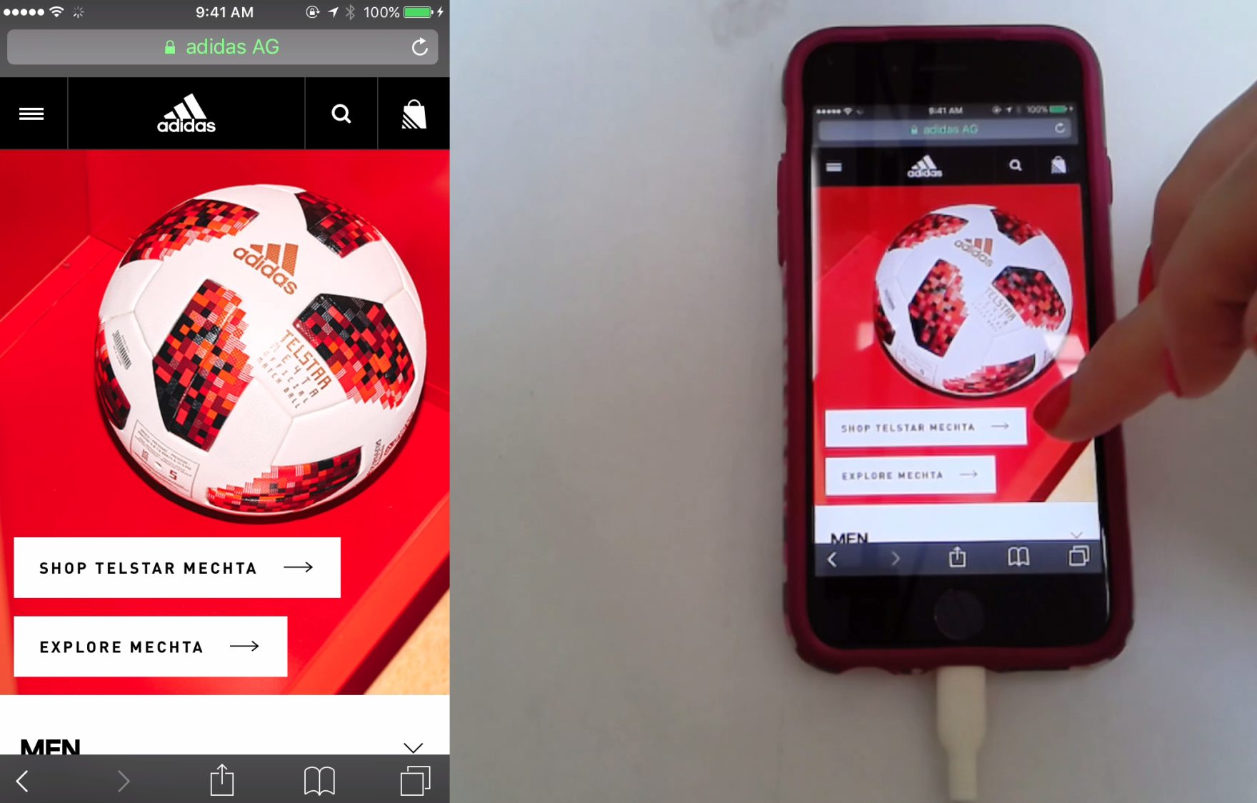 A user arriving at Adidas was presented with a country-selection overlay (first image). After choosing the US site, the overlay closed, and she began browsing the site (second image). On mobile, overlays receive more attention from users, given how the small viewport can focus users’ attention on the overlay content, compared to desktop overlays. Here, the country-selection overlay at Adidas took up 77% of the viewport, and included eye-catching flag graphics, both of which likely contributed to focussing this user’s attention on the overlay content.
