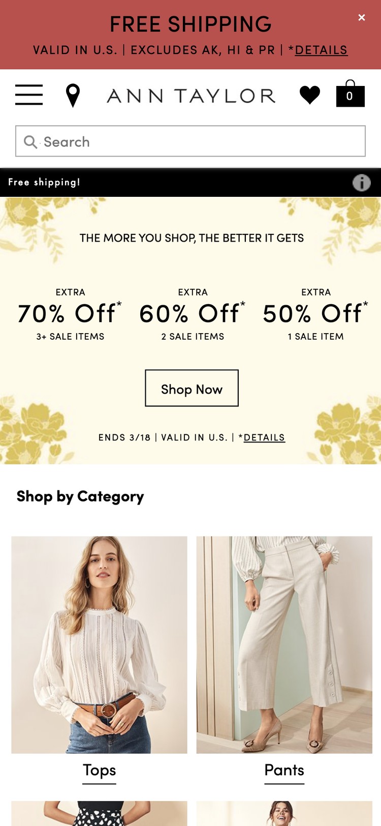 At Ann Taylor it’s difficult to see the search field right away on the homepage; the use of only an icon and textual label, its size and location, and nearby competing elements all impact its visibility.