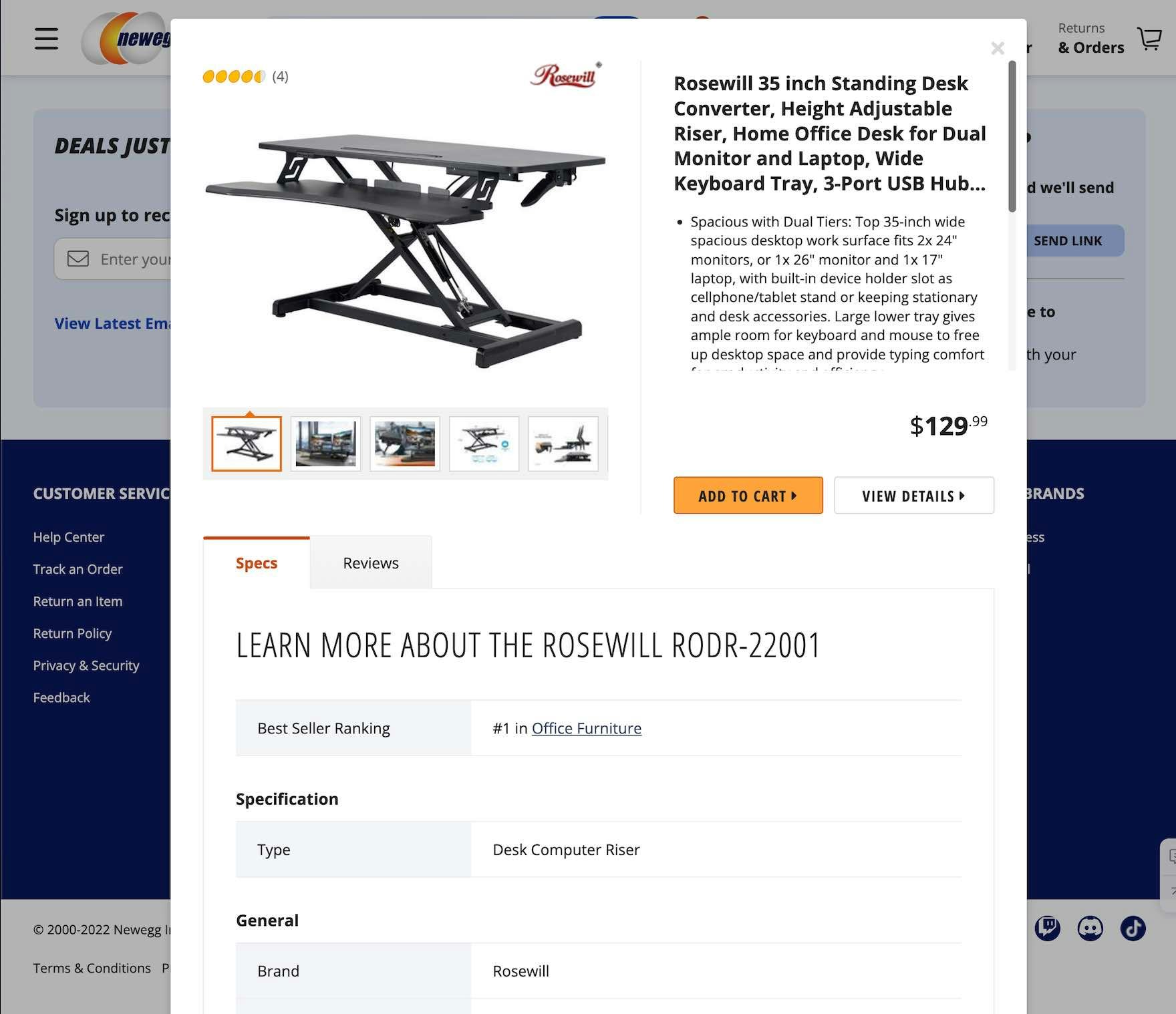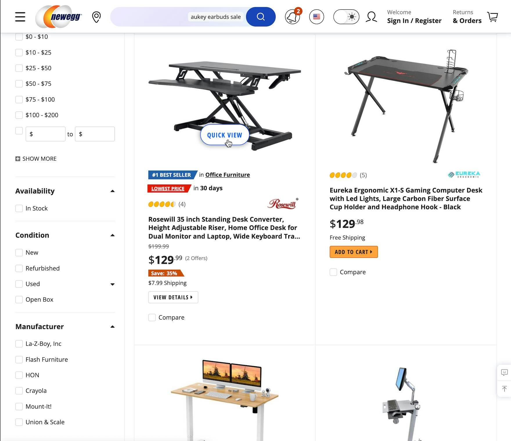 At Newegg, the “Quick View” operates as a “Product Page Lite”: halfway between a list item and a product page. Yet the additional information provided by the “Quick View” is unlikely to be decisive for users considering this standing desk — nearly all of whom will need to go to the product details page anyway to fully consider the product.