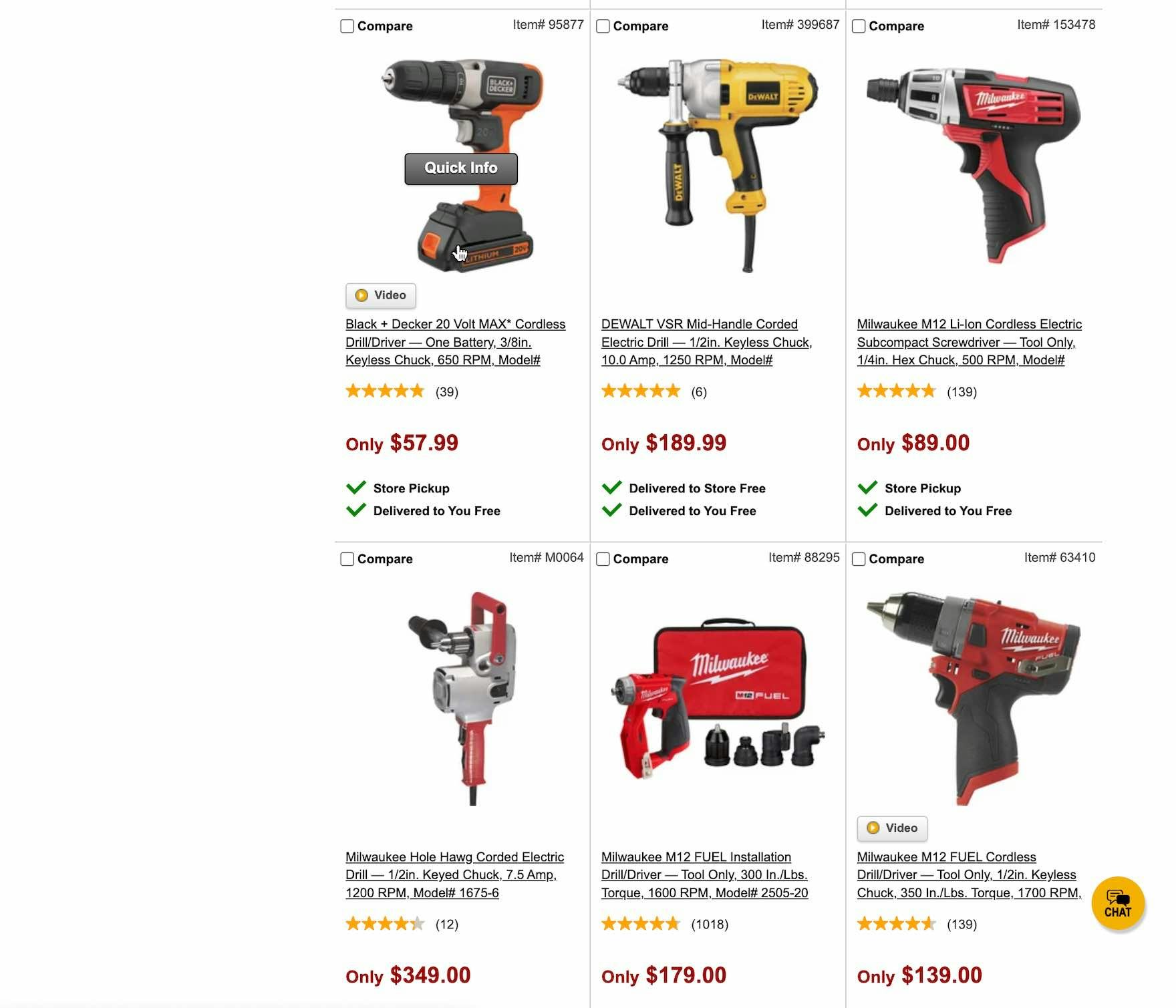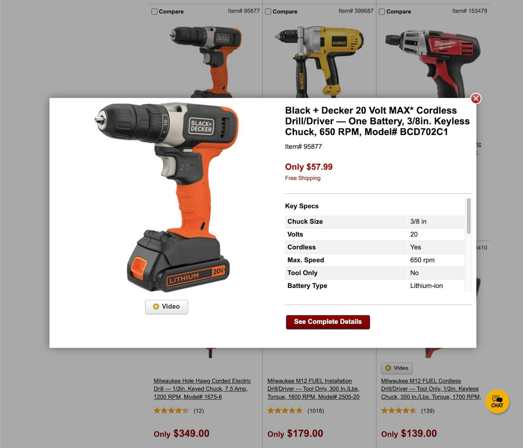 While “Quick Views” aren’t likely to be harmful to most users on Northern Tool’s product list (first image; except for those who mistakenly click on the feature when wanting to go to the product details page instead), the “Quick Views” don’t provide that much value either. The specs visible were mostly already shown in the product list, while others are out of view and users would have to scroll to see more (second image). In the end, simply going to the product page (or making use of a comparison feature) is a far better use of users’ time then fiddling with a “Quick View” on a spec-driven site.