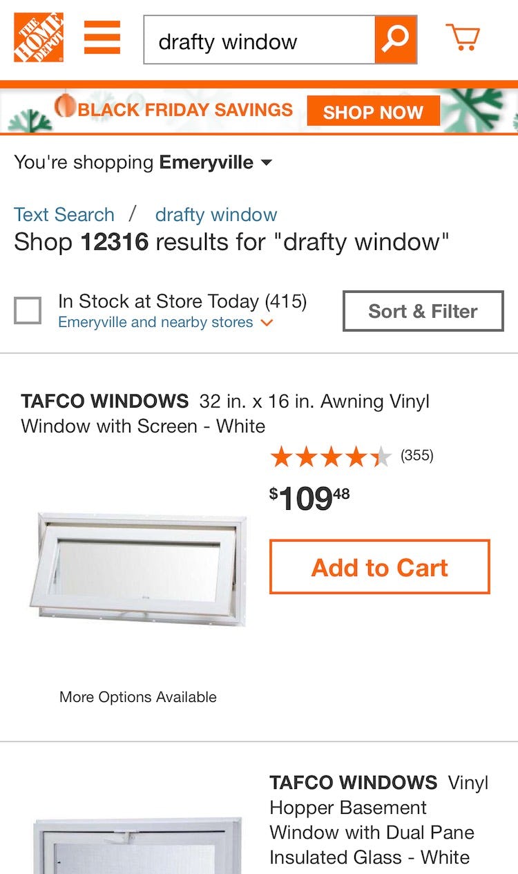 At Home Depot, a search for “drafty window” returns many results for entirely new windows, failing to address the user issue indicated in this “Symptom” search.