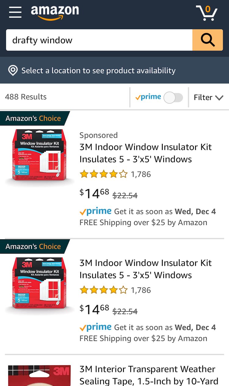 The same symptom query at Amazon for “drafty window” presents dozens of potential solutions (e.g., “window insulator kits”, “window shrink film”, “foam insulation tape”, “cold blocking drapes”, etc.), giving users a range of options to help resolve the problem.