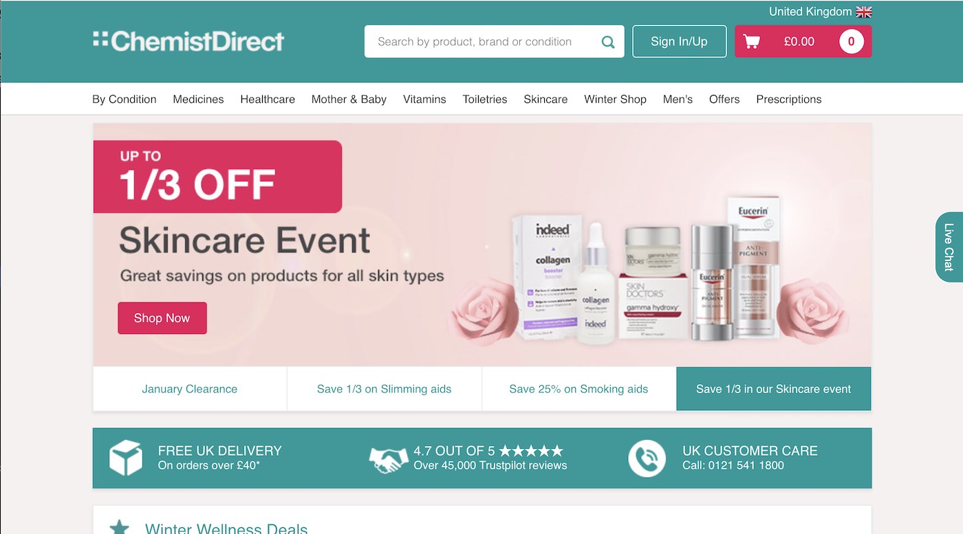 At Chemist Direct, placeholder text in the search feature suggests users ”Search by product, brand or condition” — encouraging users to search by condition (or symptom) and reassuring them that such queries will be supported.