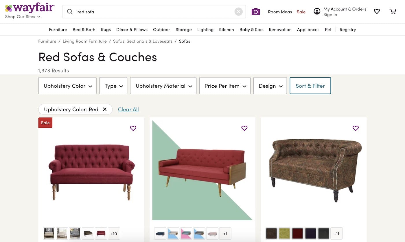 A search for “red sofa” at Wayfair returns sofas with the “red” color filter preapplied, allowing users to quickly begin browsing products that are most relevant to their query.