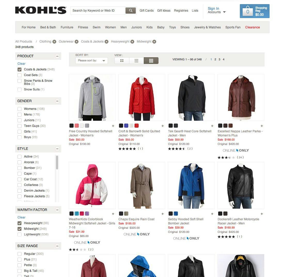 At Kohl’s there’s a clear support for thematic queries. Here a query for “winter jacket” returns the “Coats & Jackets” category, with the “Weather: Midweight” and “Weather: Heavyweight” filters preapplied.