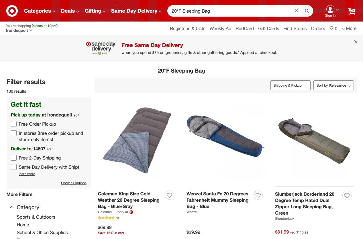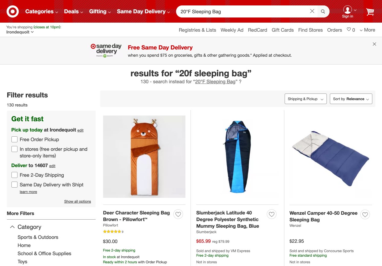 A query at Target for “20°F Sleeping Bag” strips out the degree symbol by default, making the query “20f sleeping bag” and prioritizes several irrelevant products at the top of the list (first image). However, selecting the small link “search instead for 20°F Sleeping Bag” reprioritizes the results, bringing several relevant “20 Degree Sleeping Bag” products to the top of the results (second image). Although Target does offer the option to revert to the query as typed with the symbol, it might not be obvious to all users.