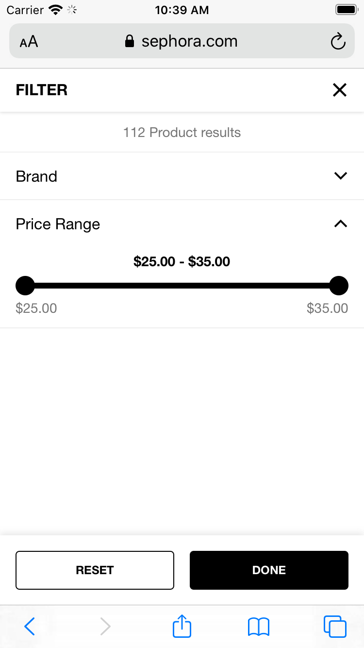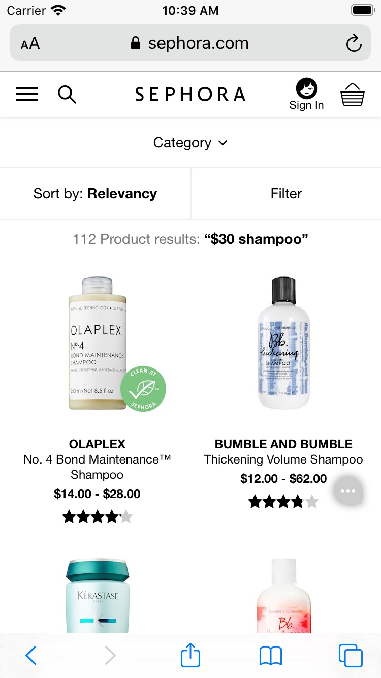 On Sephora, a search for “$30 shampoo” automatically applies a $25–35 price range filter to the search results. Applying an ever-so-slightly relaxed price range is sensible as the $30 figure can arguably be interpreted as a price indicator — a user asking for shampoos that cost $30 will likely consider a shampoo that costs $29.50 or $30.50 to be a good match.