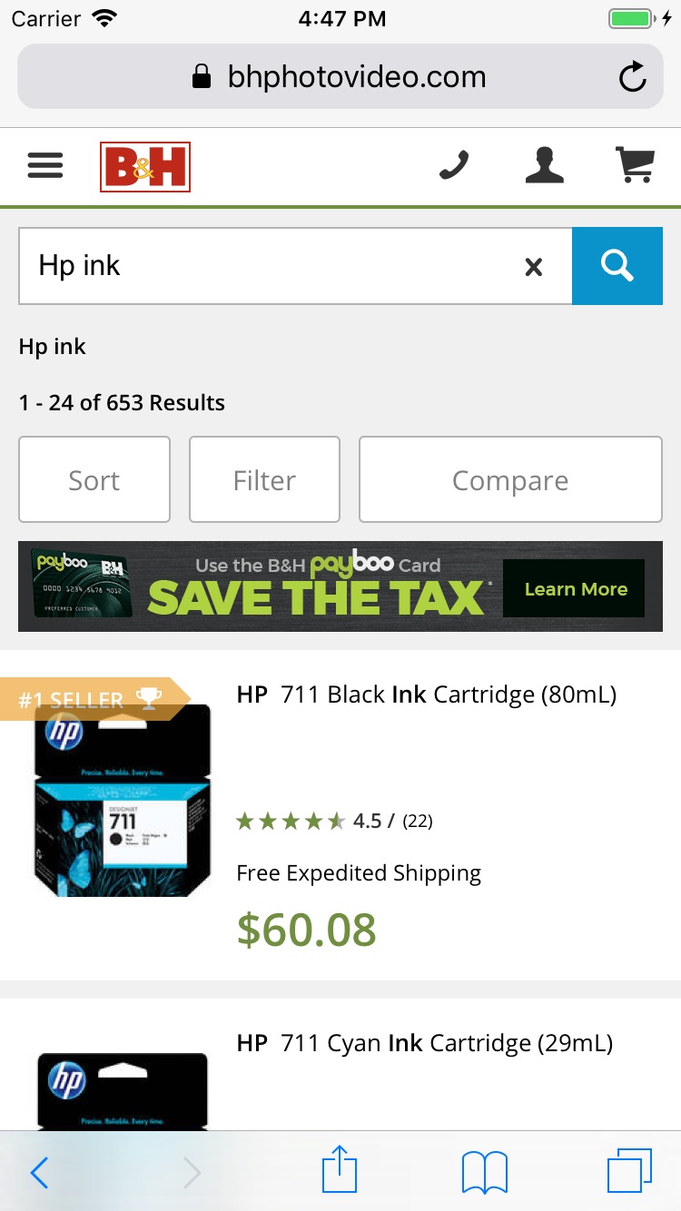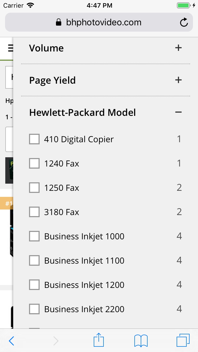 At B&H, a compatibility search for “hp ink” (first image) offers faceted compatibility filters to narrow by “Hewlett-Packard Model” (second image), helping users restrict results only to accessories compatible with their specific printer model.