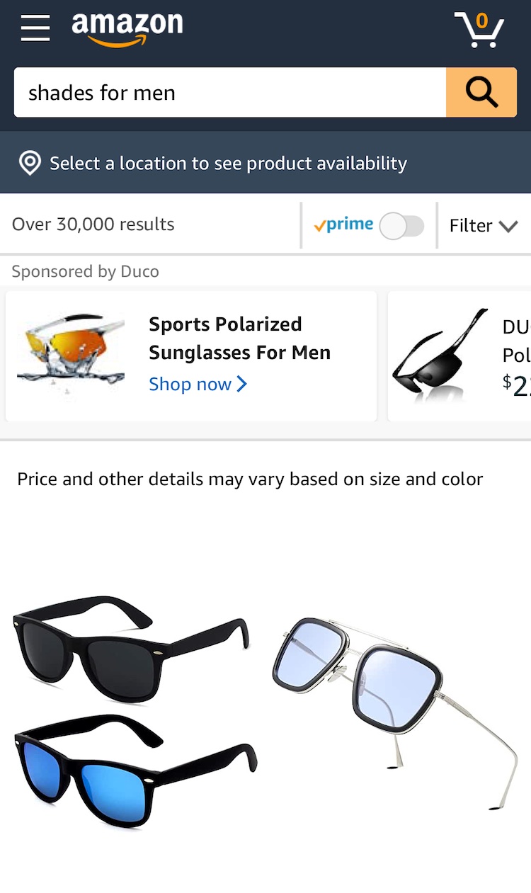 At Amazon, the same slang search for “shades for men” is well mapped to sunglasses, offering over 30 men’s and unisex sunglasses on the first page of results.