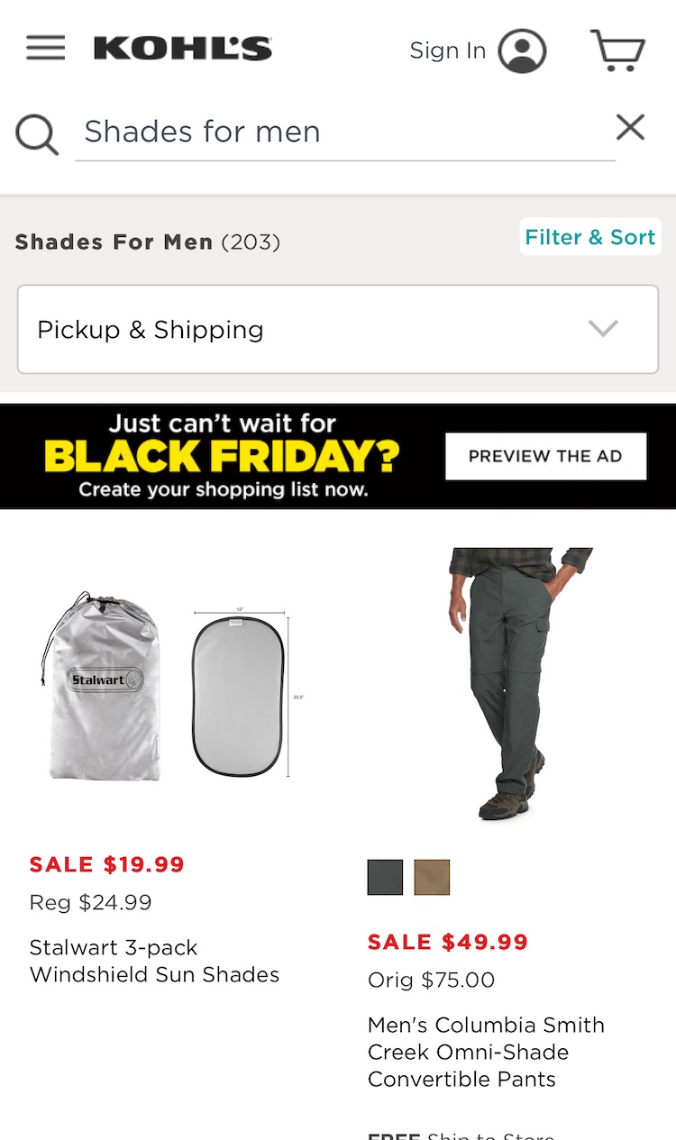A slang search for “shades for men” at Kohl’s yields many irrelevant results including sun shades, pants, polo shirts, and even t-shirts with sunglass prints on the first page of results.