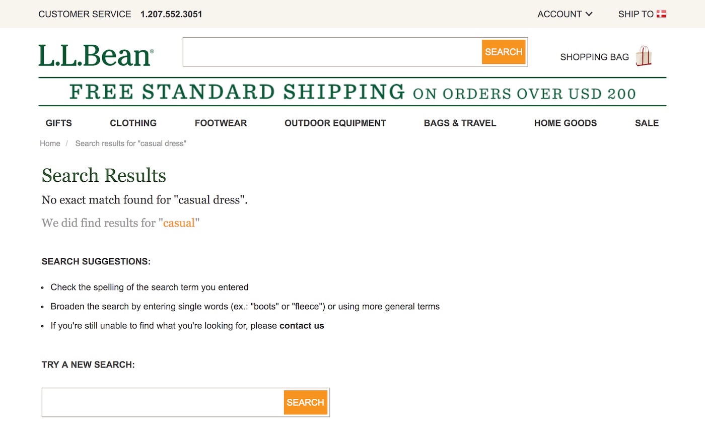 A user’s search for “casual dress” at L.L. Bean results in no product matches. Moreover, users aren’t even informed that L.L. Bean does at least carry dresses (of which many could be considered “casual”).