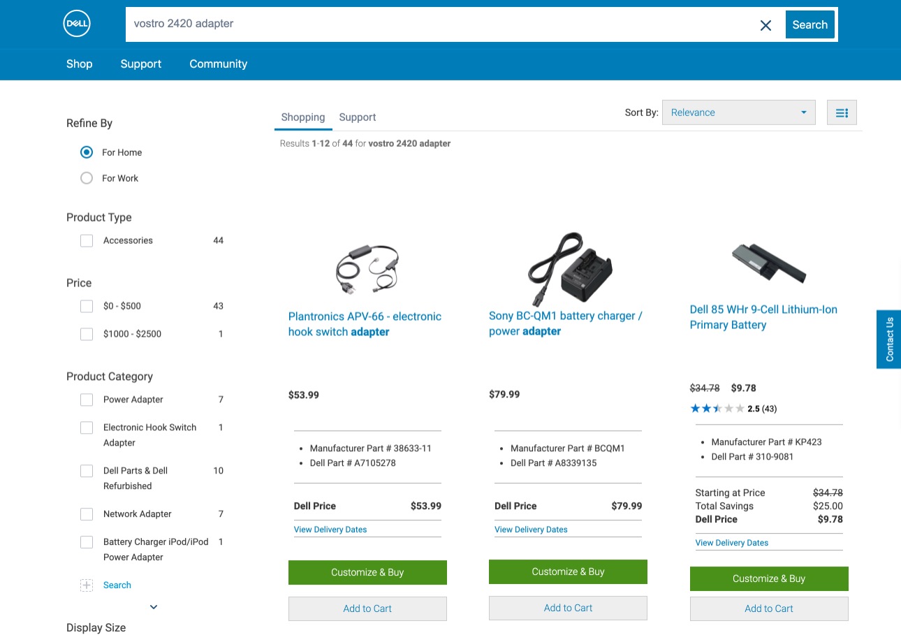 A search at Dell for “Vostro 2420 adapter” displays irrelevant products at the top of the results (a handset adapter, a camera adapter, and an incompatible battery). Moreover, users have no clear way to identify appropriate products in the list since compatibility details are excluded, meaning that users must click into each product page to determine compatibility and relevance.