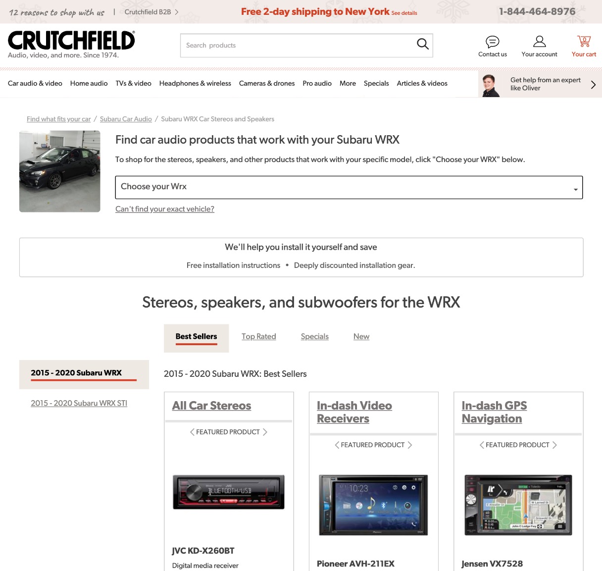 At Crutchfield, when users search for “Subaru WRX speakers”, the site detects the car brand and model and presents users with all the car stereos that are compatible with this specific car model. This allows users to quickly begin exploring products instead of having to refine their search, or trying to find relevant products through category navigation.