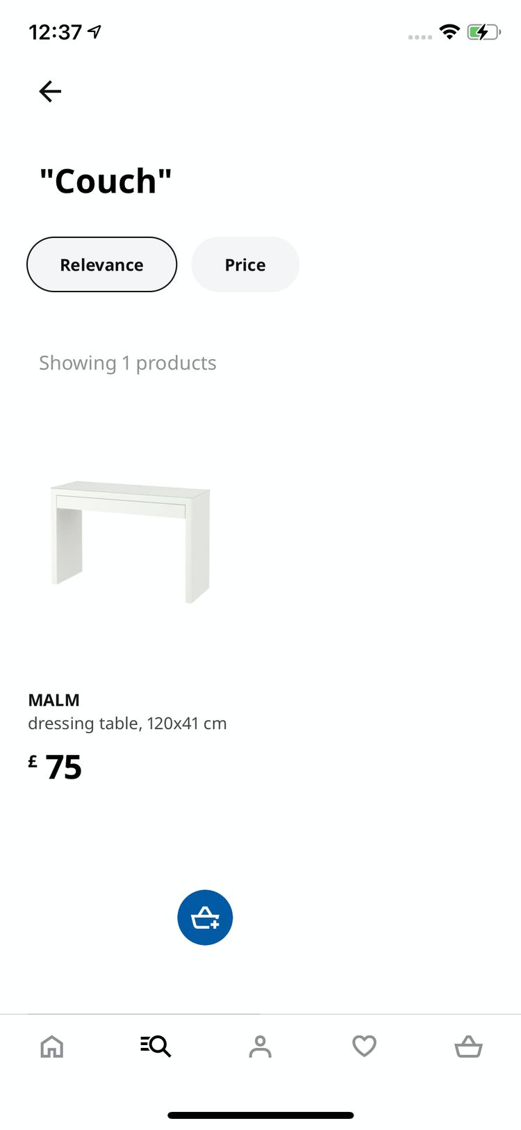 At Ikea, a search for “sofa” produces 200 product matches (first image), while a search for the synonym “couch” produces only a single product match (second image). If users search for product types using terms that aren’t an exact match for a site’s category labeling, and only a fraction of the results display, it’s a missed opportunity, since users aren’t presented with as many relevant (or full-breadth) results.