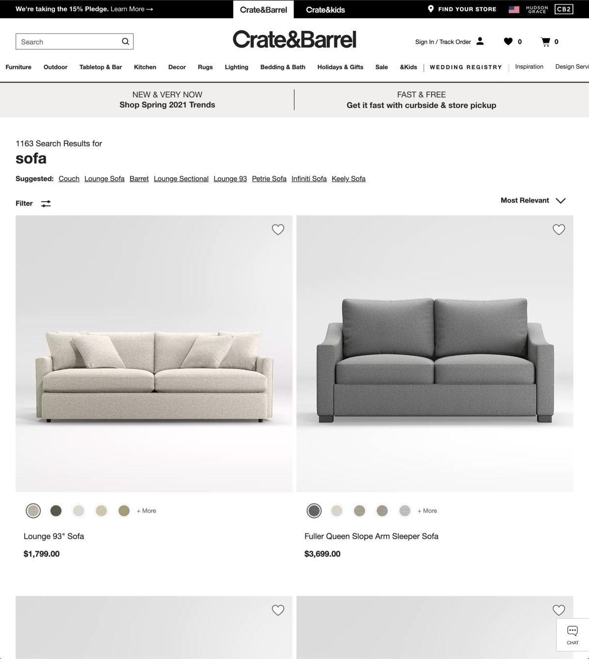 At Crate & Barrel, a search for “couch” and a search for “sofa “ yield the same results — indicating that these synonymous terms have been correctly mapped.