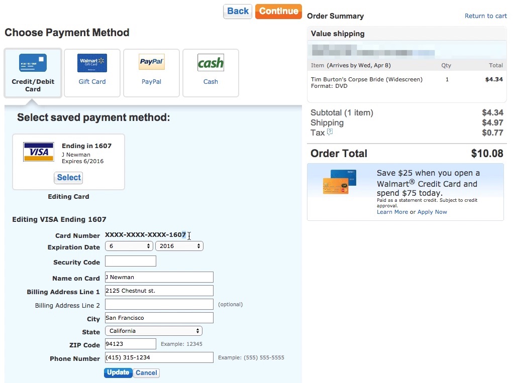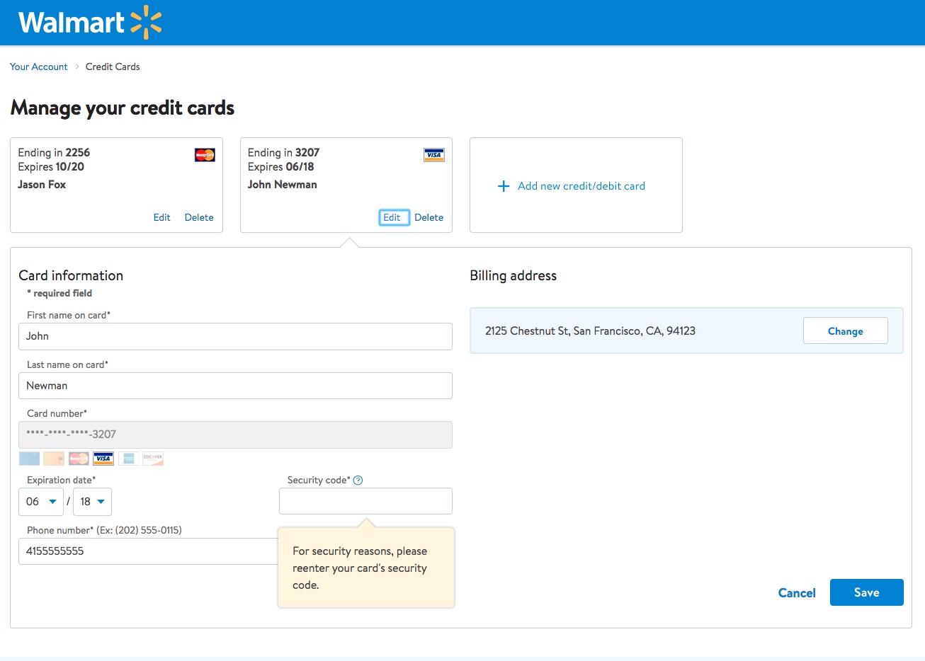 “Uhmm. You can’t. I can’t edit the card number… Why can you even “edit” the stored card if you can’t change the card number? Typically when getting a new card the card number will also be new. And I can change these [billing address and security code, ed.],” One of many confused users said at Walmart after having selected to “edit” a particular stored credit card.