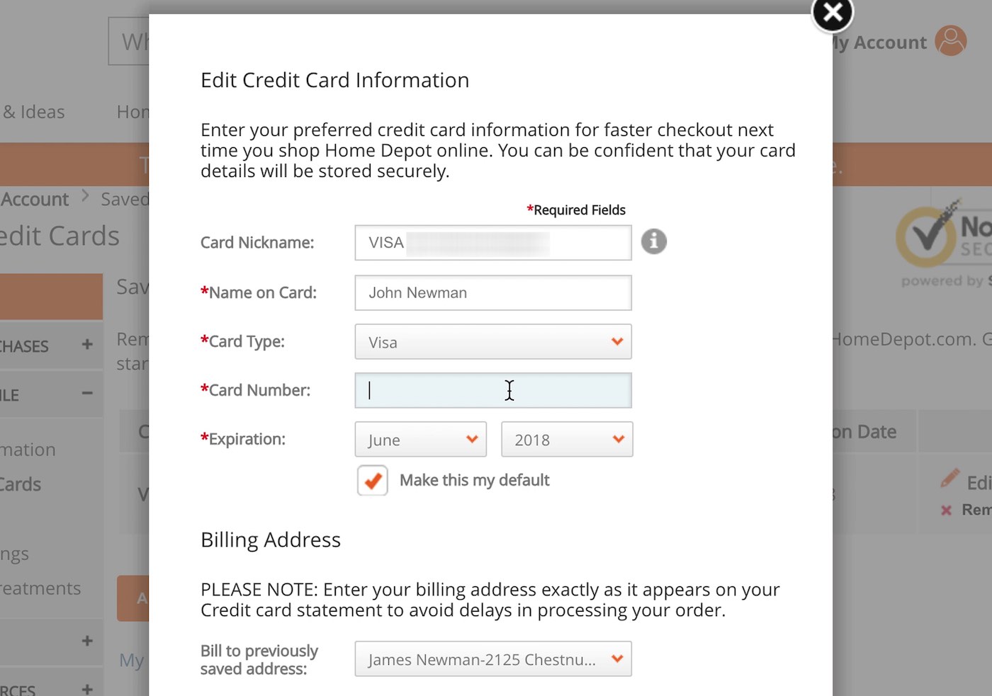 At Home Depot, the stored credit card interface provides what appears to be a one-step process for editing credit card data. In reality, the interface creates a fake editing feature by combining two processes — deleting an old card number and adding a new one — within a single “edit card” task. By default the old partially hidden card number is shown (first image). But as users click into the “Card Number” field the entire field is cleared, leaving users to type a new card number from scratch (second image).