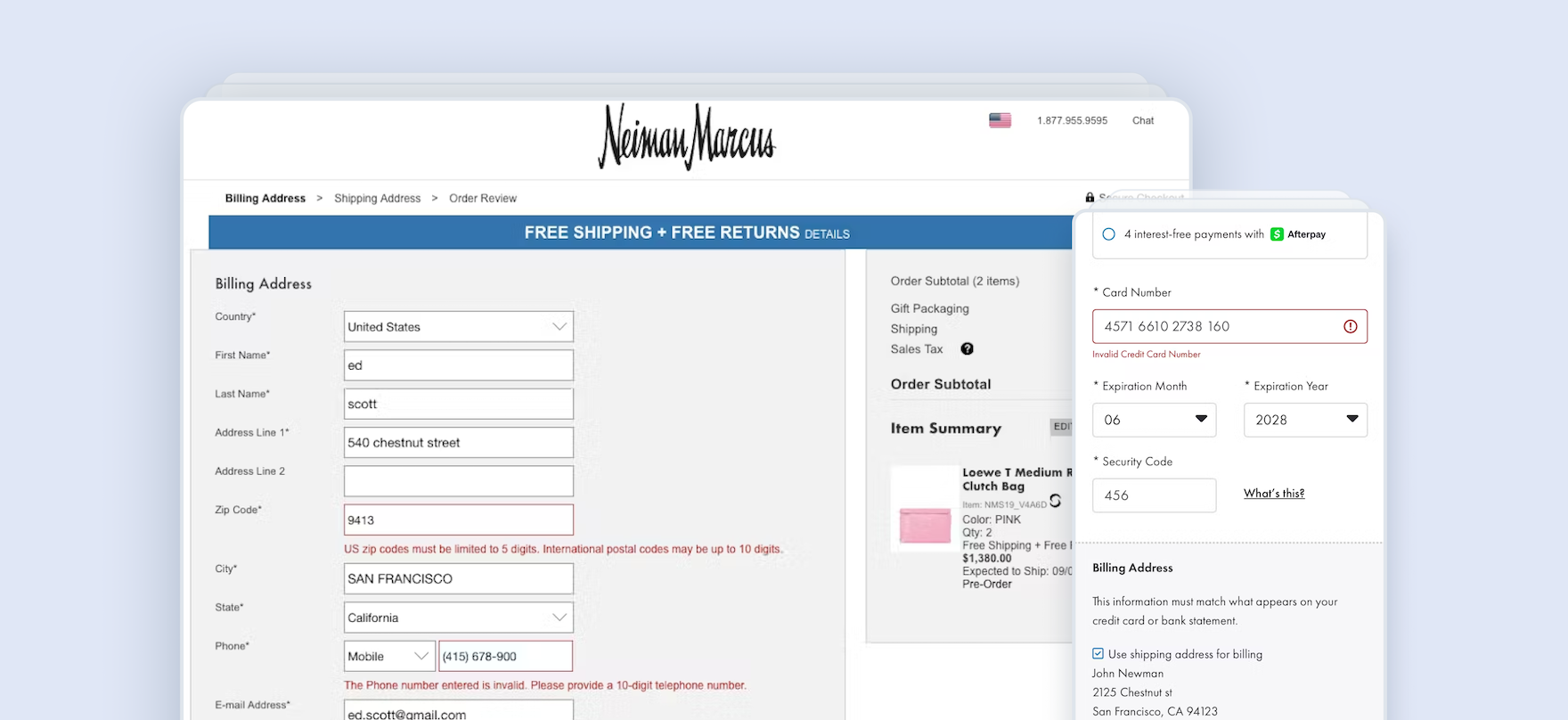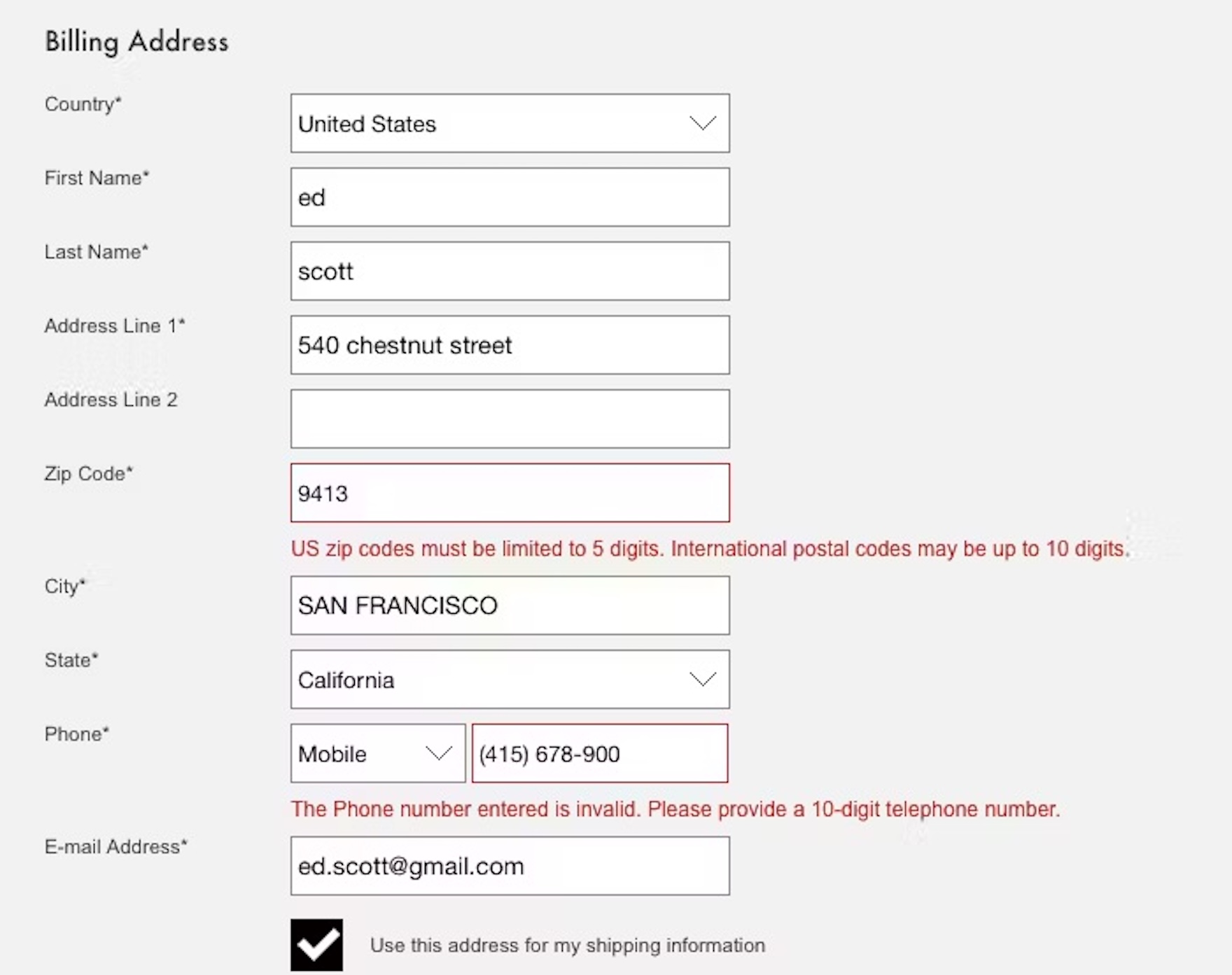 At Neiman Marcus, error messages alert users to formatting requirements for input fields. For example, the Zip code entered by the user was missing a digit, so the site alerts them to their error, as well as giving alternate formatting requirements for international users: “US zip codes must be limited to 5 digits. International postal codes may be up to 10 digits’‘.
