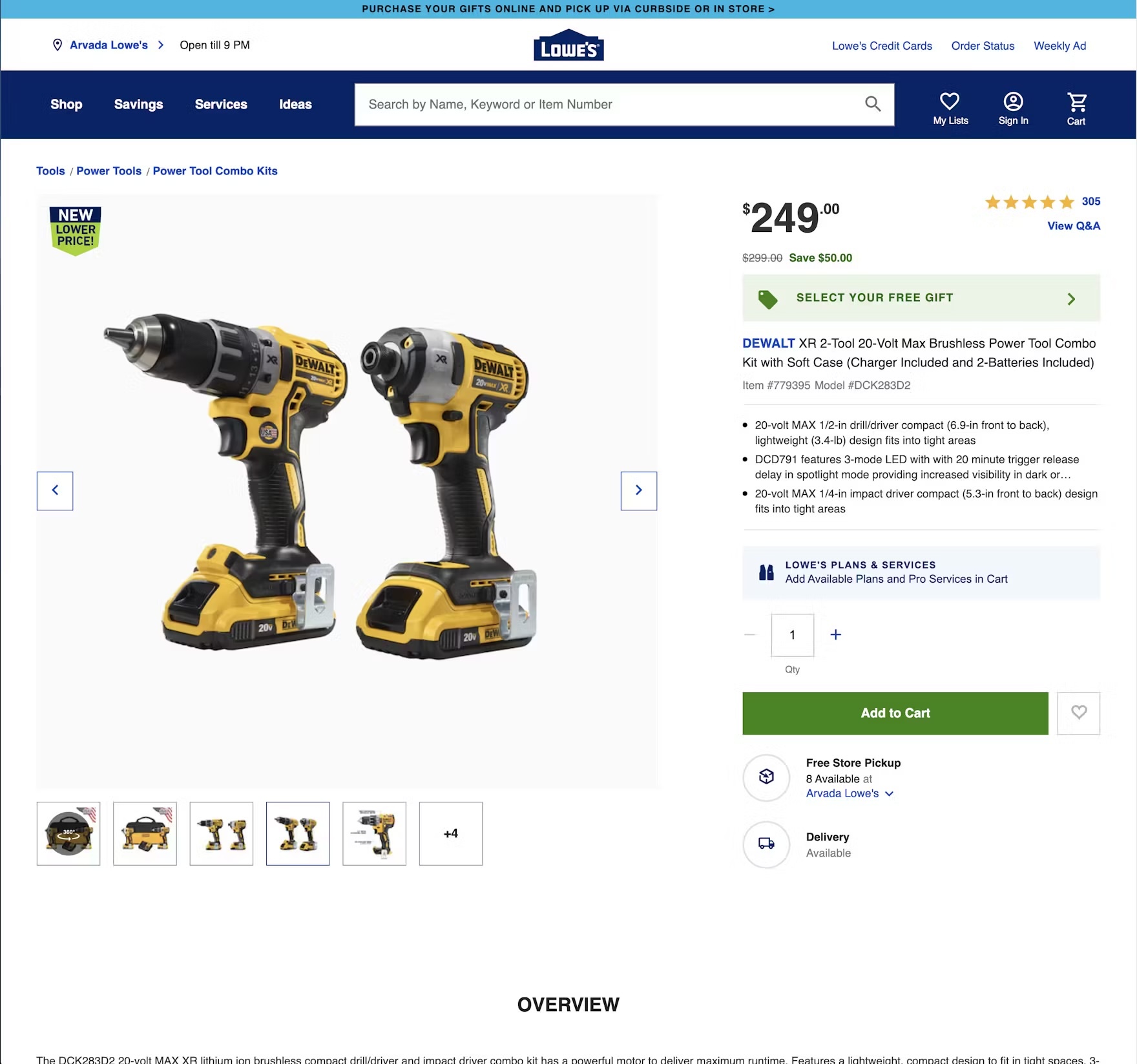 At Lowe’s, most of the visual elements on this product page have alt tags. For example, there is the primary alt text for the product image (“DEWALT Power Tool Combo Kits #DCK283D2 Product Image #3”). Then there is an additional alt tag for the badge at the top (“new lower price”). Finally there is an alt tag for the review stars (“5.0 out of 5 stars with 305 reviews”). Together these tags convey all the necessary nontext information visible on the page. Note, there is no separate alt tag for the thumbnail image.